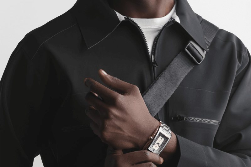 Циферблат серебристого цвета с вертикальным сатинированием, декорированный в стиле “ар деко”. Рисованные арабские цифры и часовые метки черного цвета и стрелки с “синением”.