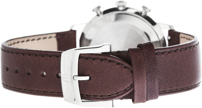 Швейцарский кварцевый механизм Maurice Lacroix с аналоговой индикацией. Погрешность точности хода не превышает -10/+20 секунд в месяц. Функции: центральные часовая, минутная и маленькая секундная стрелки, индикация даты апертуре между отметками “4” и "5 часов", хронограф с индикаторами 30 минут и 1/10 секунды.
