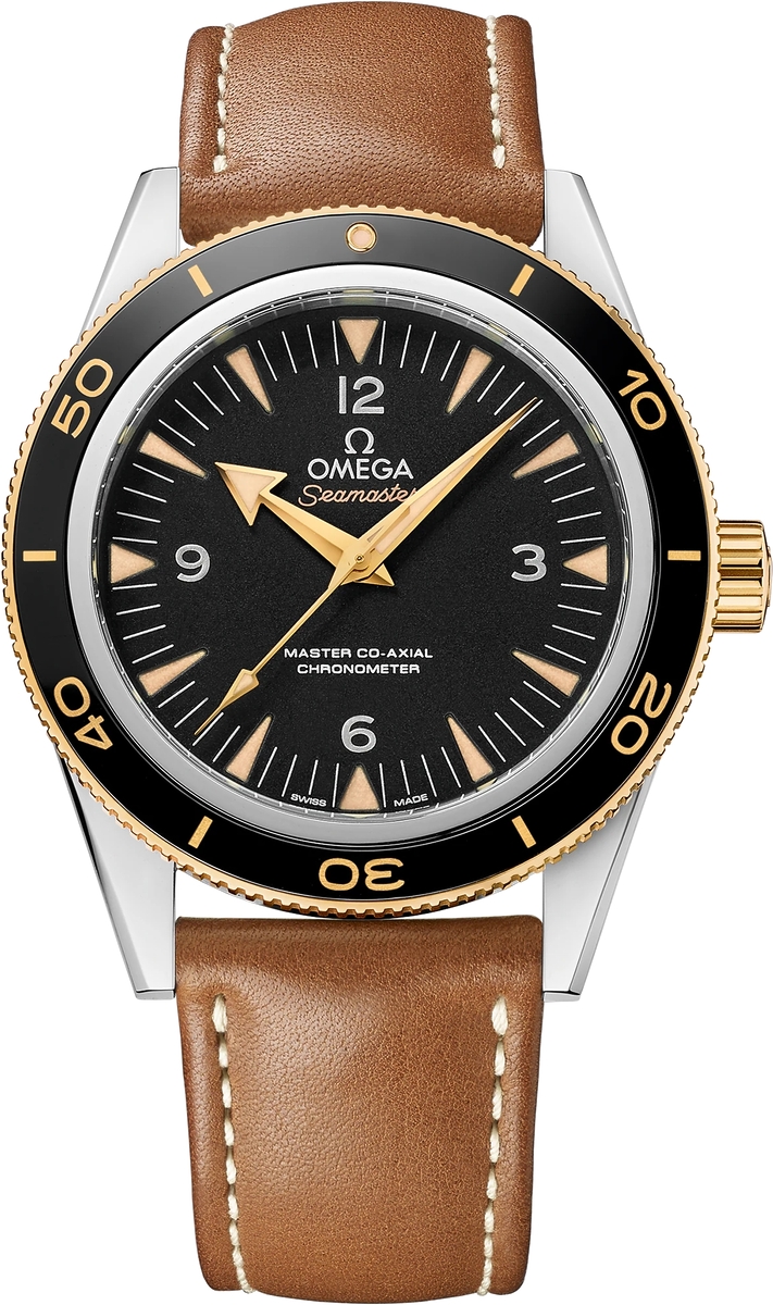 Модель 233.22.41.21.01.001 на коричневом ремешке из телячьей кожи, ширина 21 мм. Браслетная застежка из титана, раскладывающаяся при нажатии на кнопки двойной системы блокировки, с рельефным логотипом Omega.
