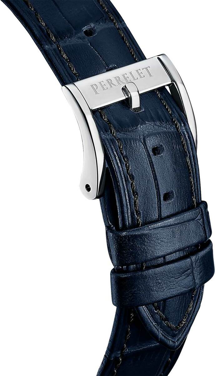 Круглый корпус Perrelet A1304/A выполнен из высокосортной нерж. стали с зеркальной полировкой поверхности. Диаметр корпуса составляет 39 мм, толщина - 9,56 мм. Задняя крышка с прозрачным окном соединяется с корпусом 6 винтами. Водостойкость 5 АТМ.