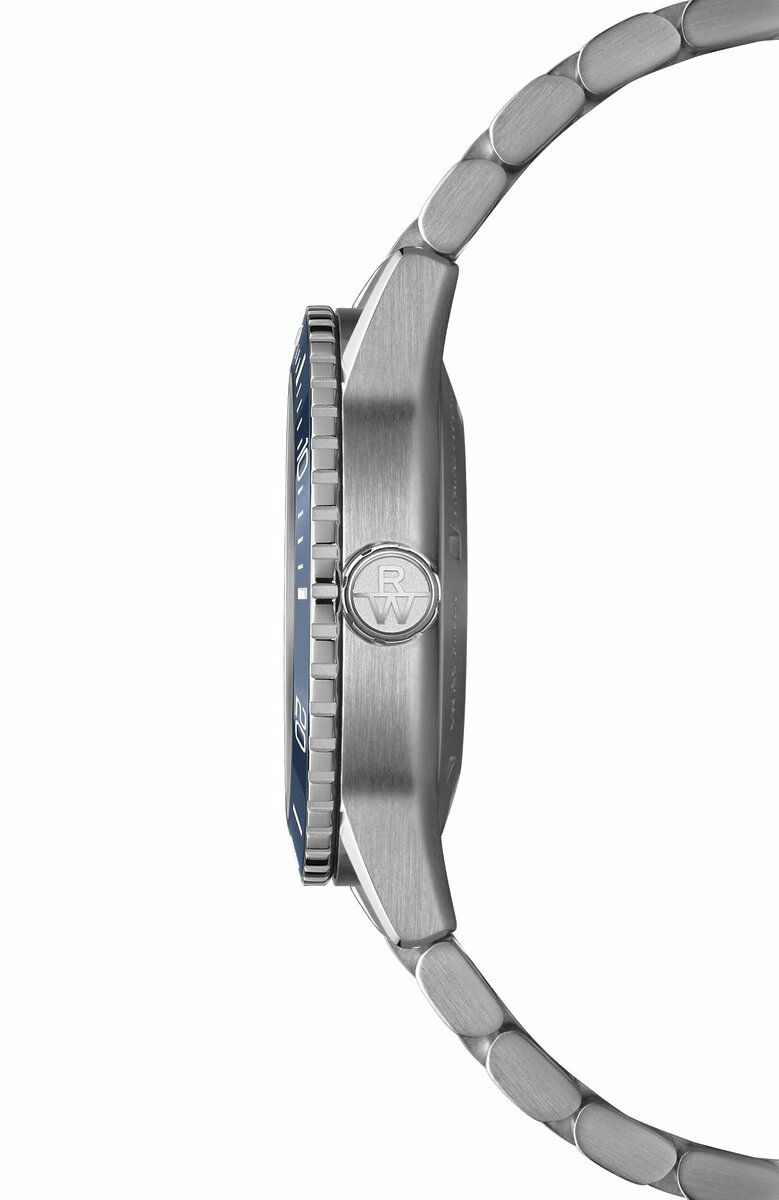Корпус круглой формы выполнен из нержавеющей стали марки 316L с матовой шлифовкой и глянцевой полировкой. Диаметр корпуса модели составляет 36 мм, толщина – 10.3 мм. Вращающийся в одном направлении безель с керамической накладкой и контрастной разметкой, выполненной с использованием Super-Luminova. Задняя крышка имеет резьбовое соединение с корпусом. Завинчивающаяся заводная коронка с монограммой RW. Водостойкость на глубине до 300 метров (30 бар/АТМ)