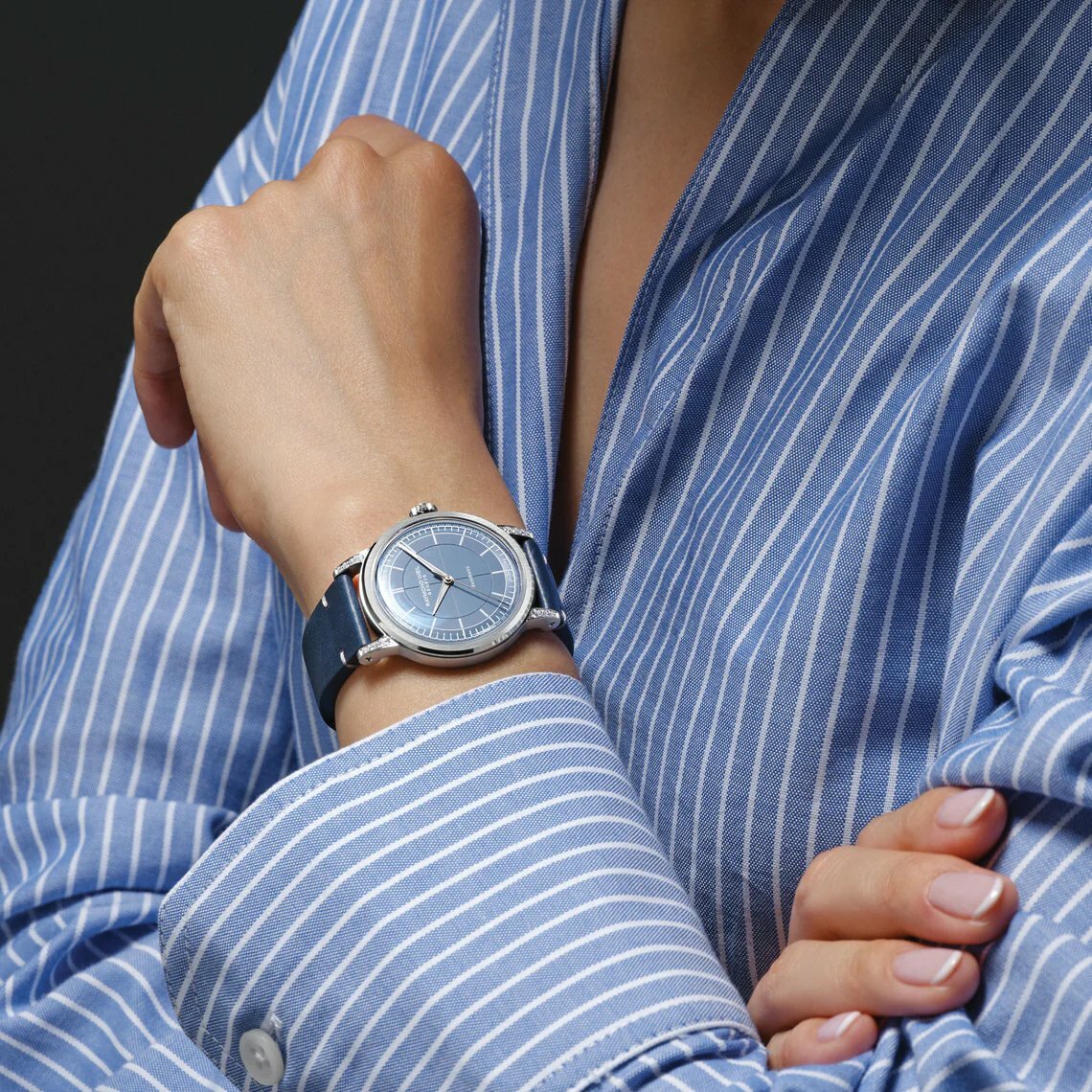 Циферблат Millesime 2125-SCS-50011 синего цвета с разделением на сектора и различными видами финишной отделки. Аппликация часовых индексов и серебристые стрелки с покрытием Super-LumiNova.