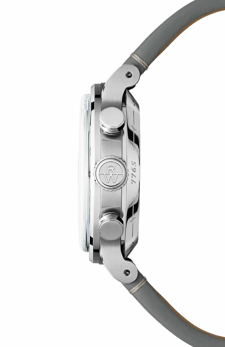 Швейцарский механизм с автоподзаводом, калибр RW5030, с запасом хода 62 часа, частотой 28 800 пк/час, на 27 камнях. Погрешность точности хода не более -10/+15 сек. в сутки. Центральные часовая, минутная и маленькая секундная стрелки. Функция хронографа с центральной секундной стрелкой, 12-часовым и 30-минутным индикаторами.