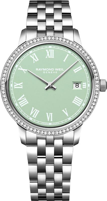 Циферблат пастельно-зеленого цвета с сатинированием, печать римских цифр белого цвета и граненые стрелки с серебристым покрытием.