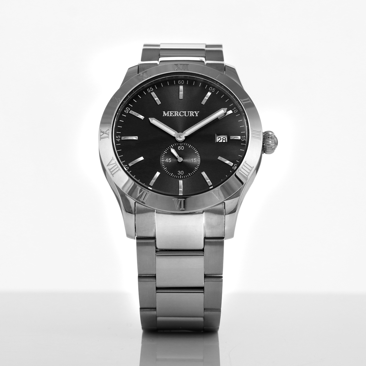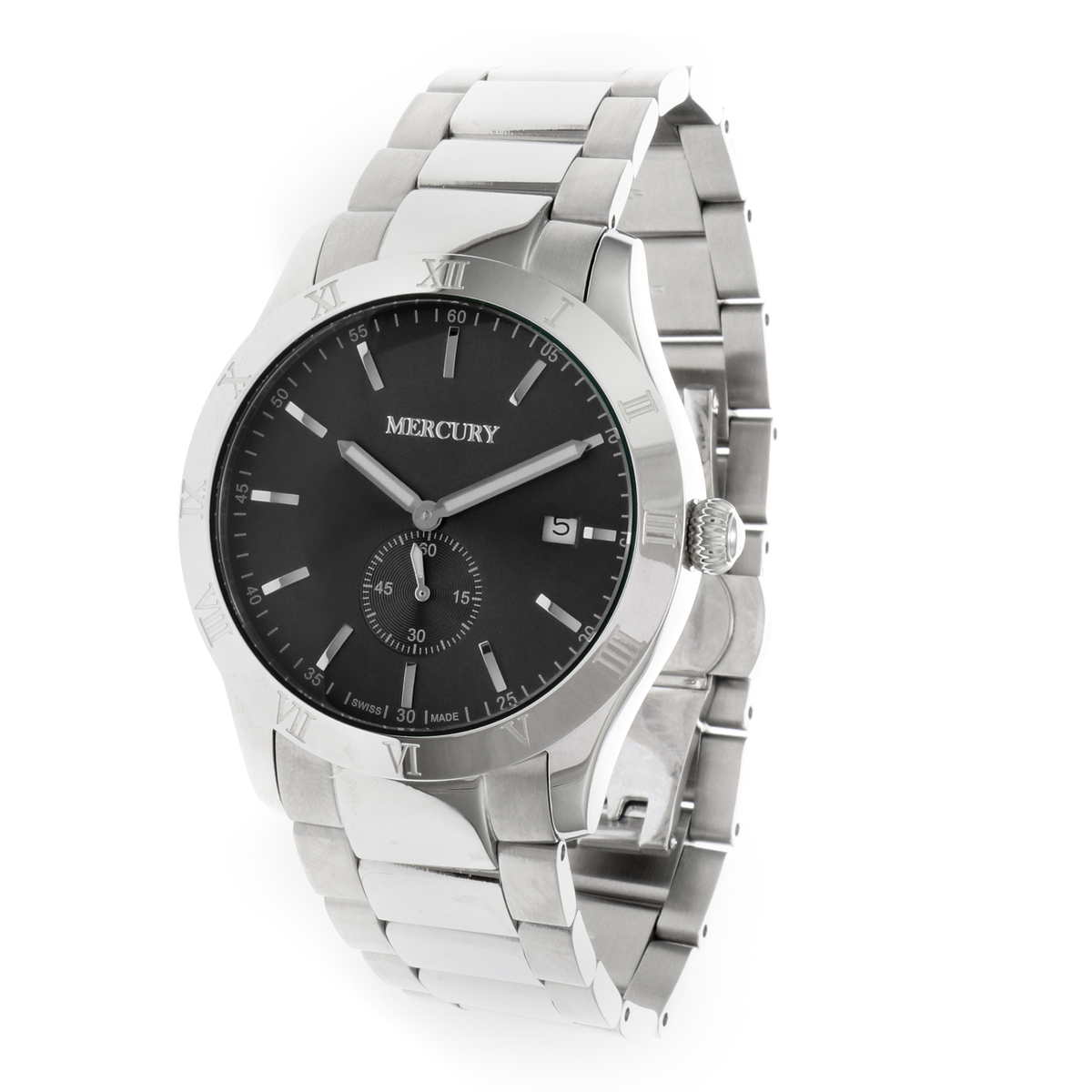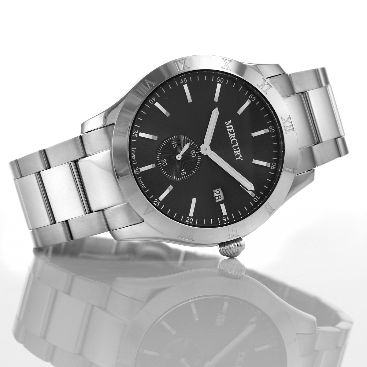Циферблат модели Mercury MEM469-SS-3 глубокого черного цвета, дополнительный индикатор со стилизацией под гильоширование в виде концентрических кругов. аппликация часовых индексов и стрелки с серебристым покрытием.