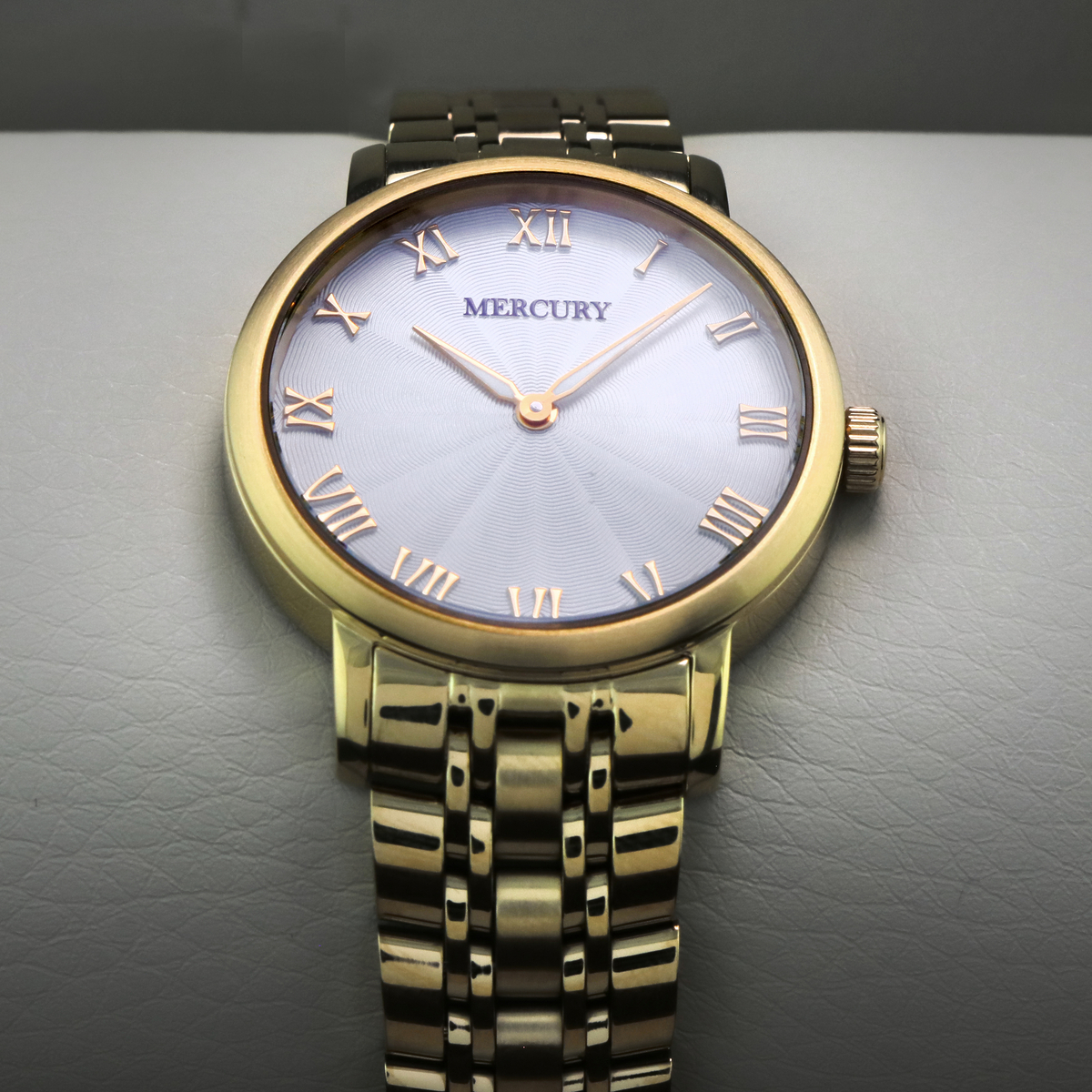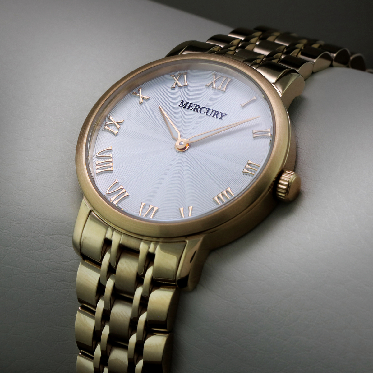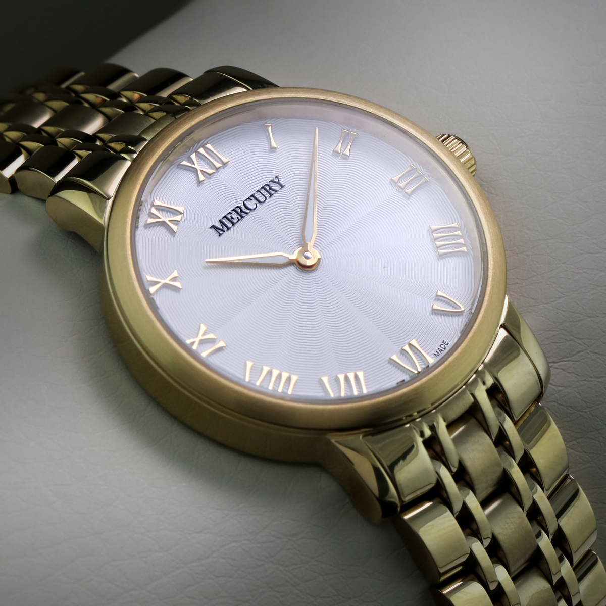 Циферблат модели Mercury ME400-GG-1 серебристо-белого цвета со стилизацией под гильоширование в стиле “капли воды”. Печать стилизованных римских цифр и стрелки с золотым покрытием.