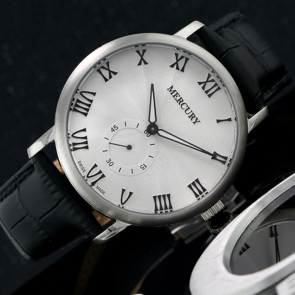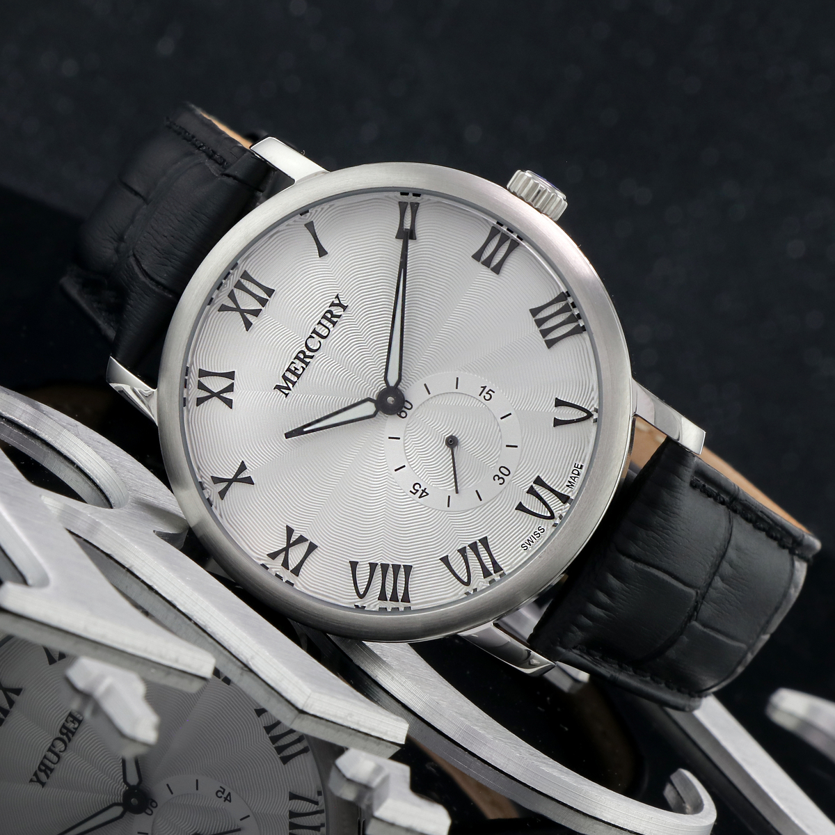 Циферблат модели Mercury ME405-SL-1 серебристо-белого цвета со стилизацией под гильоширование “капли воды”. Печать римских цифр и стрелки с черным покрытием.