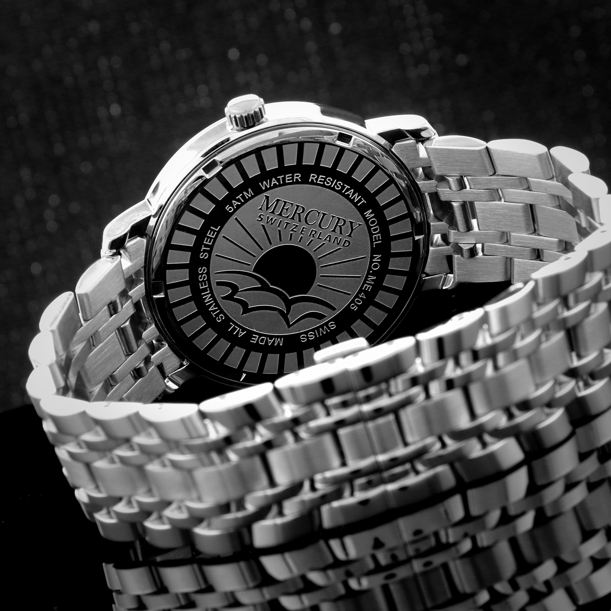 Корпус выполнен из нержавеющей стали марки 316L. Диаметр корпуса модели Mercury ME400-SS-9 составляет 42.0 мм, толщина - 9.1 мм. Задняя крышка с гравировкой. Водозащита 50 метров (5 ATM, 169 feet).