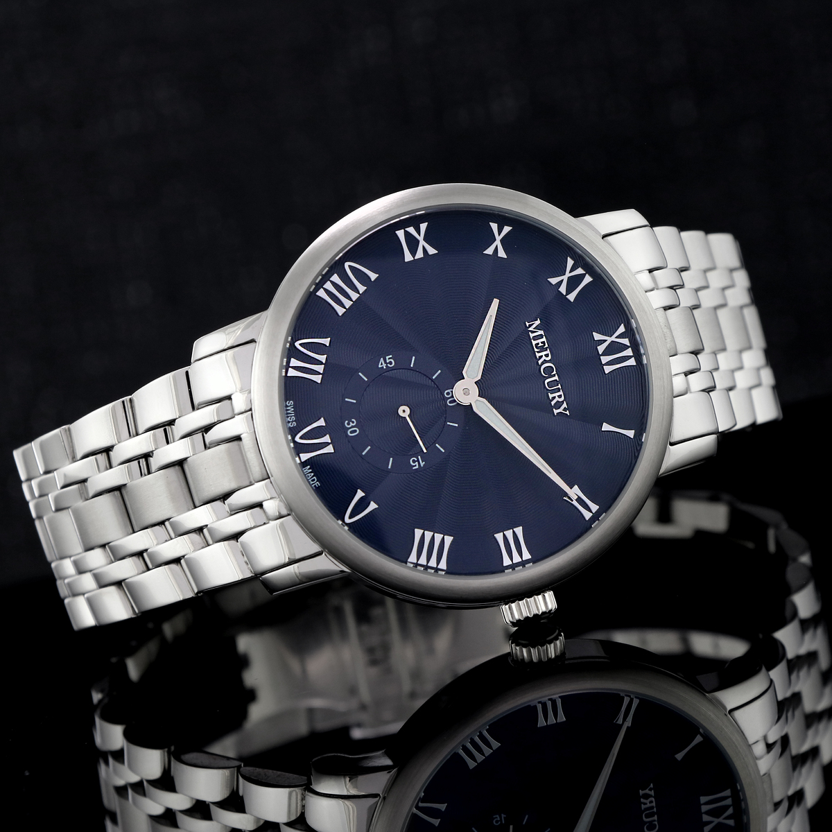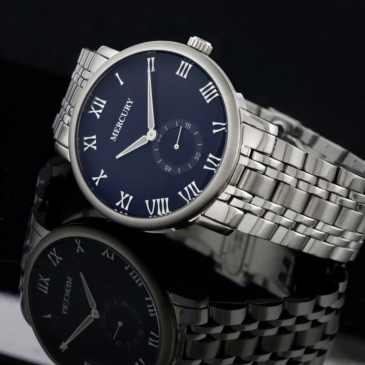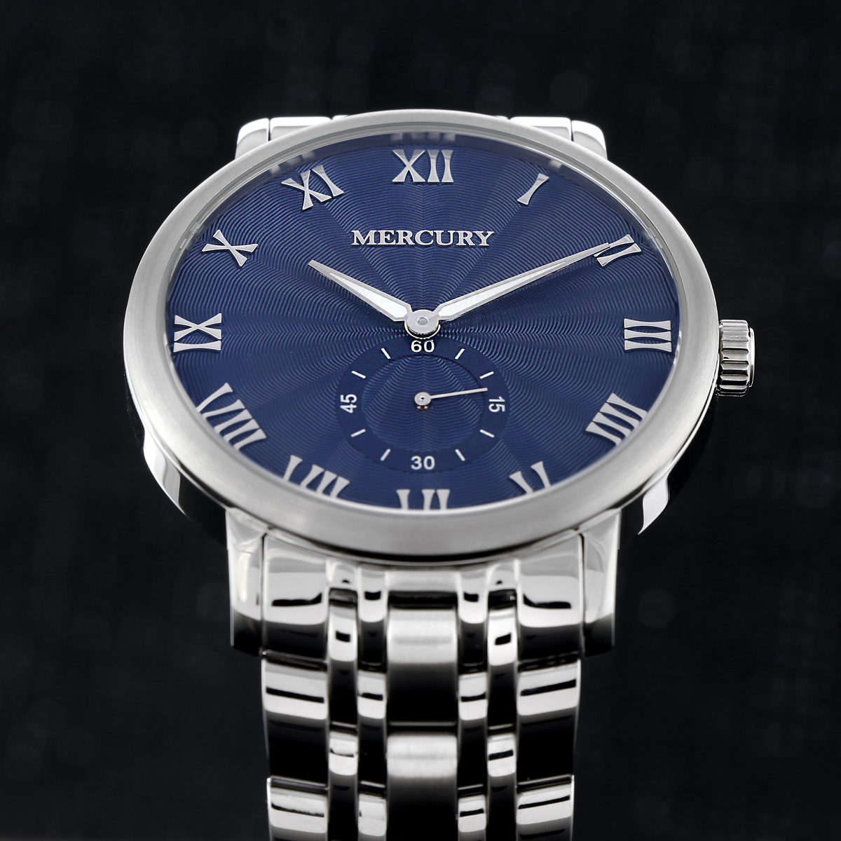 Циферблат модели Mercury ME405-SS-9 глубокого синего цвета со стилизацией под гильоширование в стиле “капли воды”. Печать стилизованных римских цифр и стрелки с серебристым покрытием.