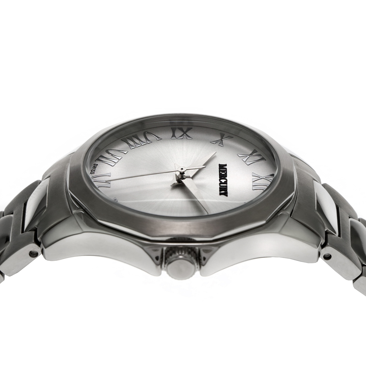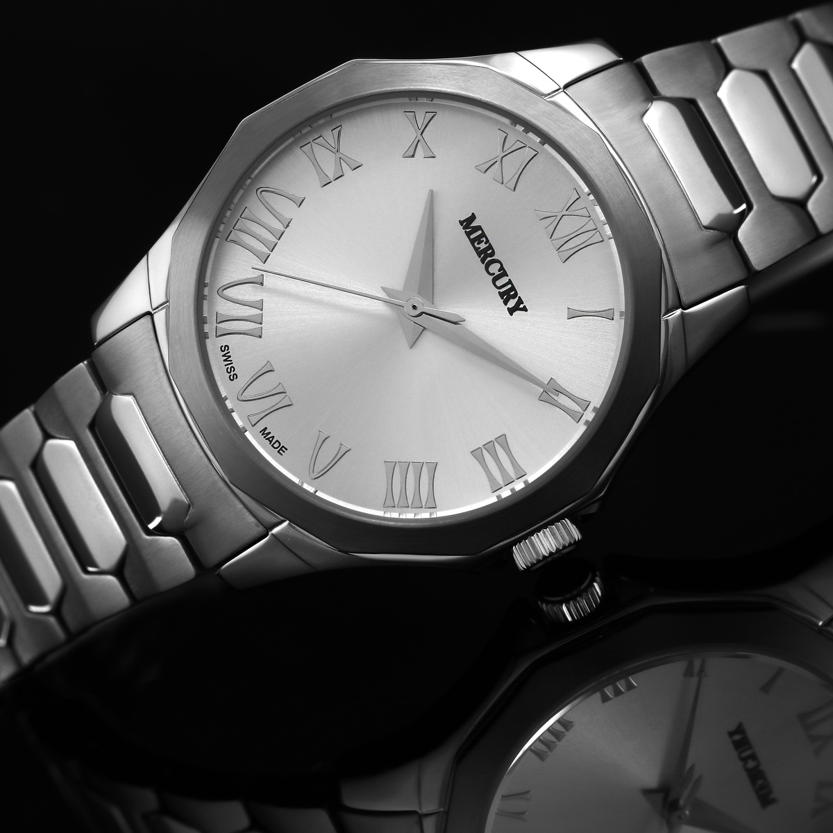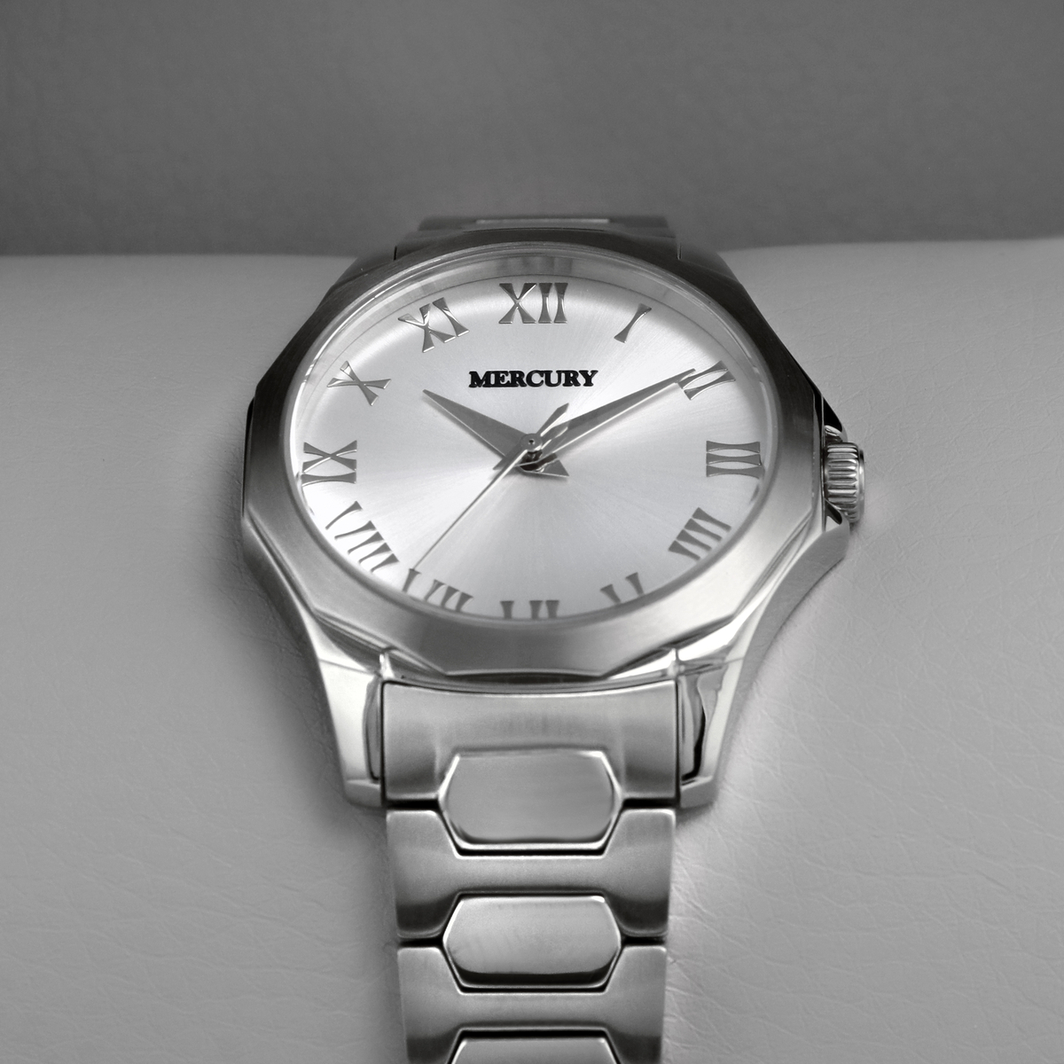 Циферблат модели Mercury MEL461-SS-1 серебристо-белого цвета со шлифовкой в стиле “солнечные лучи”. Печать стилизованных римских цифр и стрелки с серебристым покрытием.
