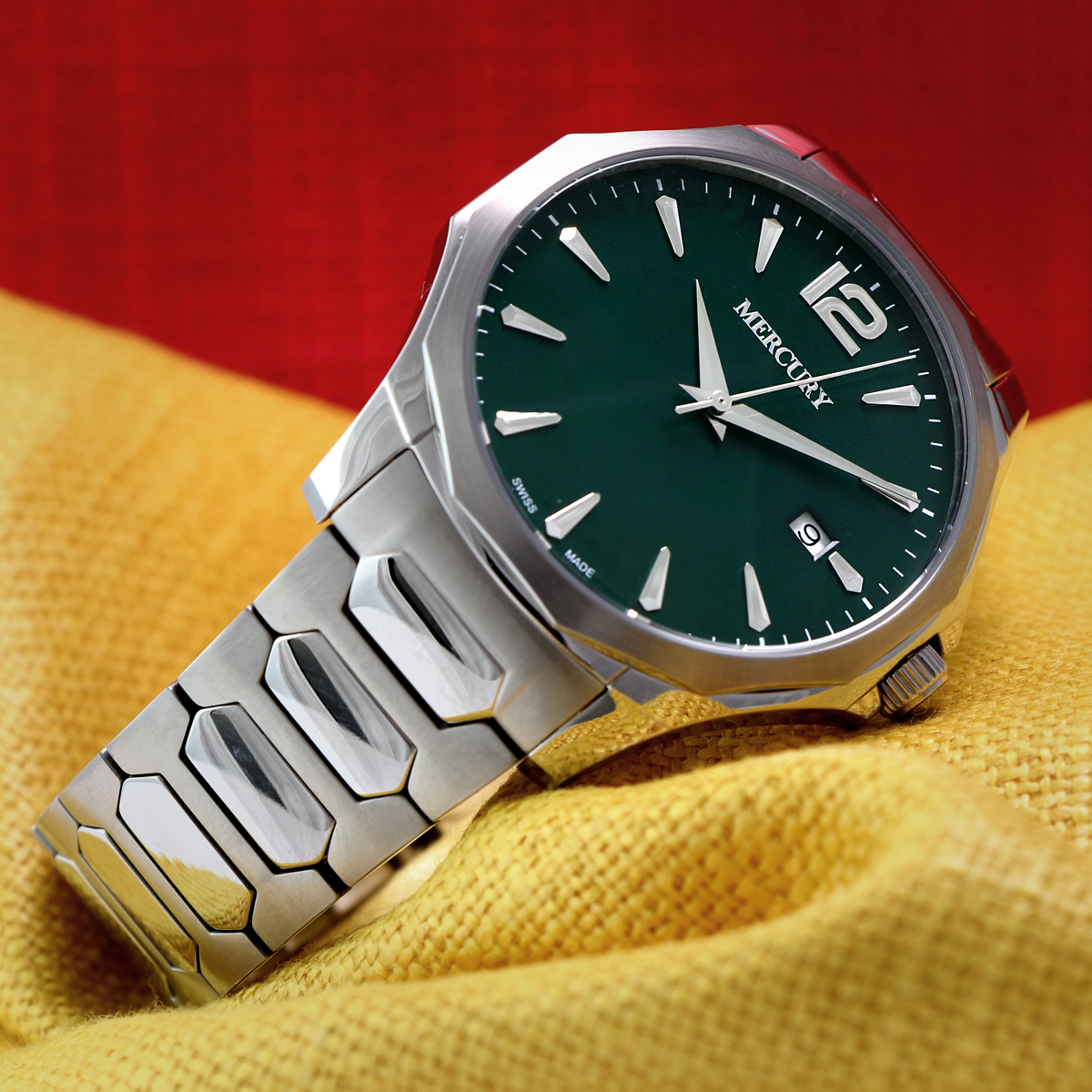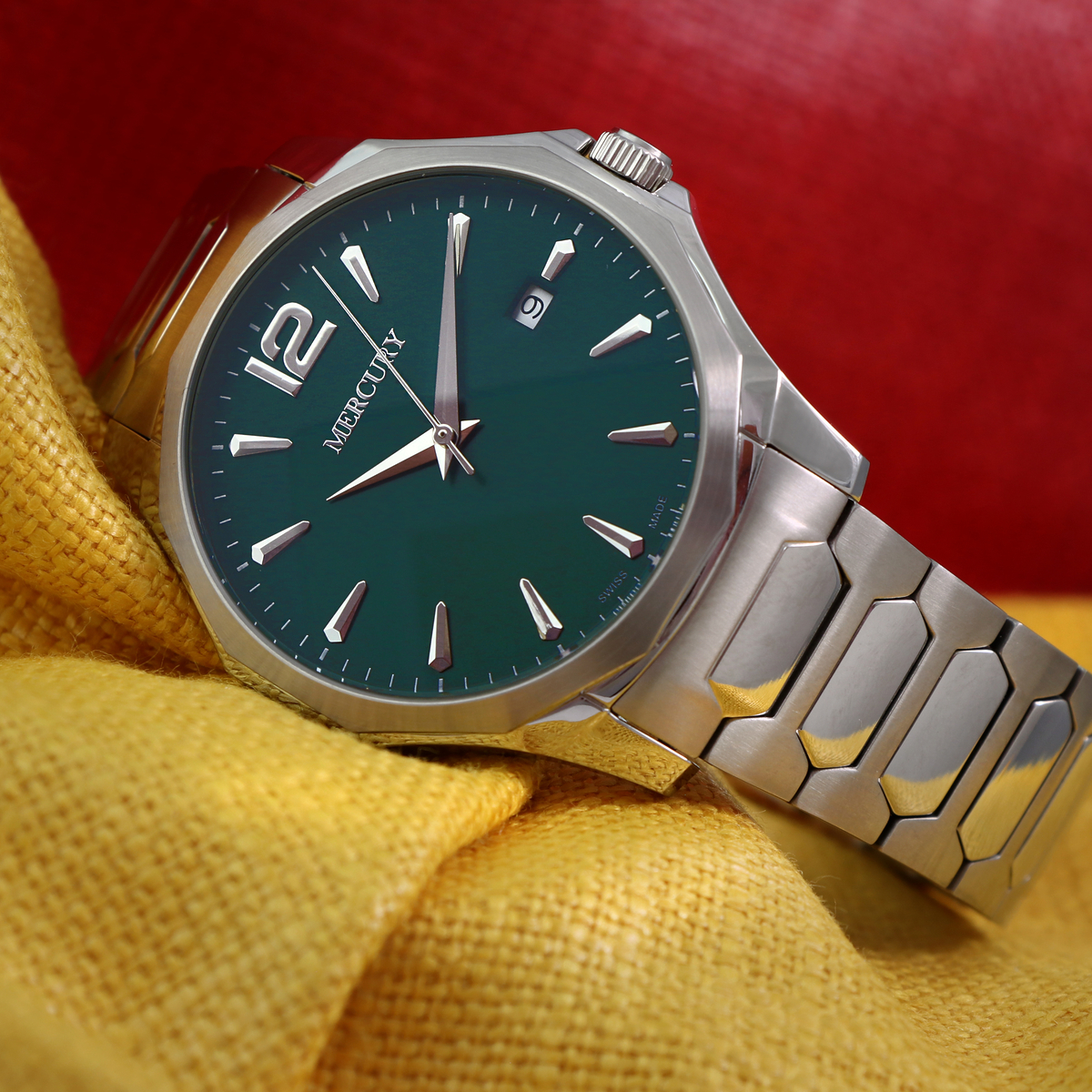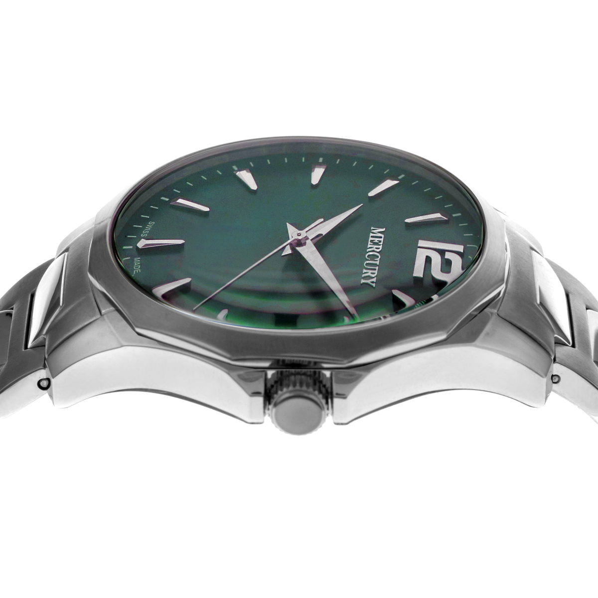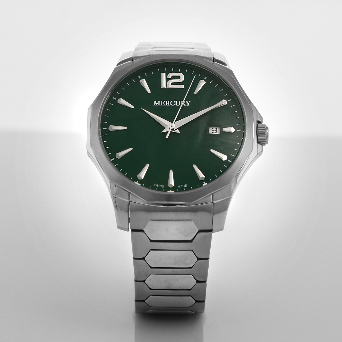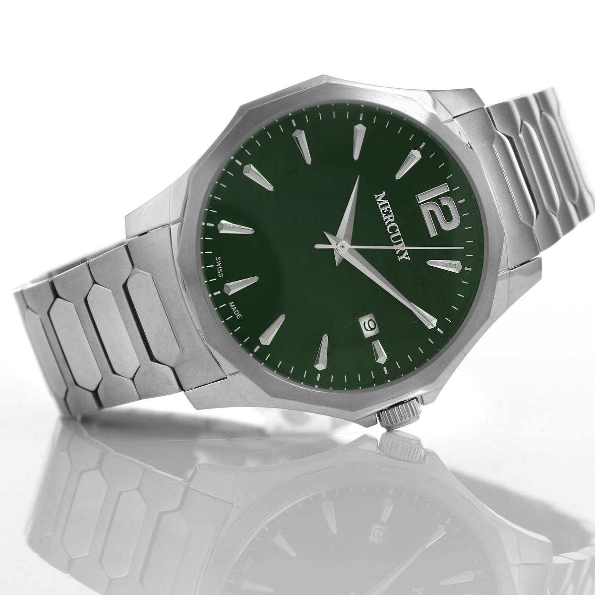 Циферблат модели Mercury MEM466-SS-12 зеленого цвета с матовой шлифовкой. Аппликация цифр и часовых меток, а также стрелки с серебристым покрытием.