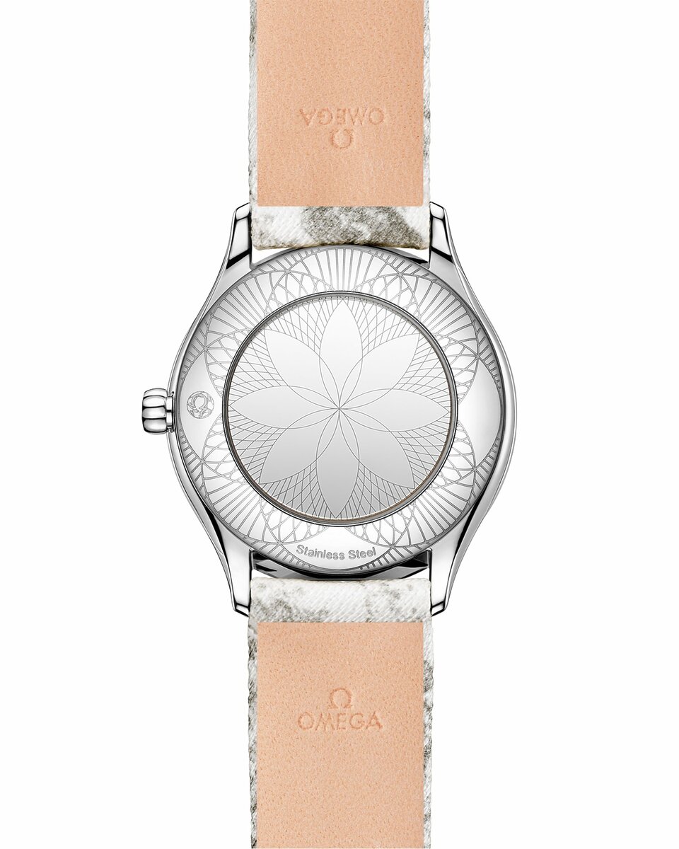 Круглый корпус модели Omega De Ville Mini Tresor 428.17.26.60.04.002 выполнен из нержавеющей стали, диаметр 26 мм, высота вместе с дужками - 31.13 мм, толщина - 7.46 мм. Инкрустация 34имеет куполо бриллиантов «Top Wesselton» VVS. Полированная заводная головка украшена красной liquid-керамикой в виде цветка из 5 логотипов марки и инкрустированным бриллиантом. Захлопывающаяся задняя крышка с гравированным тематическим узором "Her Time". Водонепроницаемость 3 бар (30 метров / 100 футов).