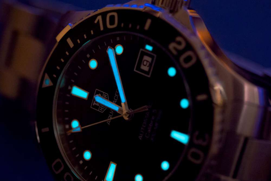 SuperLuminova в два раза ярче состава 1993 года, часы с этой подсветкой полюбились дайверам. Метки циферблата, обработанные люминофором, отлично читаются на любой глубине. Яркий пример — часы TAG Heuer Aquaracer, уже ставшие классическим элементом экипировки любителя дайвинга. Граненые индексы и стрелки модели покрыты белым люминофором SuperLuminova. Время свечения с момента контакта с источником света — 6-12 часов. При этом часы не погаснут в один момент — яркость подсветки будет равномерно снижаться каждый час. Часы с такой подсветкой подойдут и для глубоководных погружений, и для продолжительной вечерней прогулки.