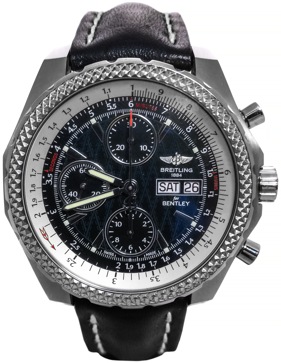 Сейчас Вы на странице Breitling For BENTLEY Continental GT. Это часы спортивного дизайна, механика с автоподзаводом, хронограф, Стальной корпус, черно - белый гильошированный циферблат, сапфировое стекло с небольшими потертостями антибликового покрытия, логарифмическая шкала, поворотный безель, черный кожаный ремень. На фотографиях Вы видите именно те часы, которые предлагается к продаже.