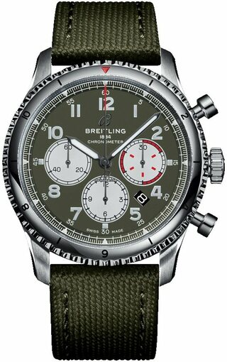 Мужские наручные механические с автоподзаводом часы в прочном круглом корпусе из нержавеющей стали. Собственный калибр Breitling 01, сертифицированный хронометр. Через прозрачную заднюю крышку можно рассмотреть механизм. Запас хода около 70 часов. Циферблат цвета хаки защищен от царапин сапфировым стеклом. Индикатор даты у отметки "4,5 часов", арабские цифры, часовая, минутная и секундная стрелки. На цифры, часовую и минутную стрелки нанесено специальное покрытие, благодаря которому сверять время можно даже в темноте. Современная многофункциональная модель часов с трехсекционным хронографом. Ремешок выполнен из прочного текстиля цвета хаки и регулируется по длине. Модель посвящена самолету P-40 Warhawk: на обратной стороне корпуса имеется гравировка с его изображением.