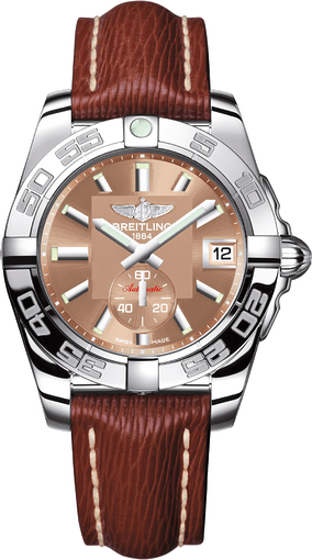 Циферблат Breitling Galactic 36 Automatic бронзового цвета, центральная часть в виде квадрата украшена продольным гильошированием, индикатор маленькой секундной стрелки украшен гильошированием в виде концентрических кругов. Аппликация эмблемы швейцарской марки и часовых индексов, а также стрелки имеют покрытие родием. Фотолюминесцентный состав на стрелках, разметке циферблата и на безеле.
