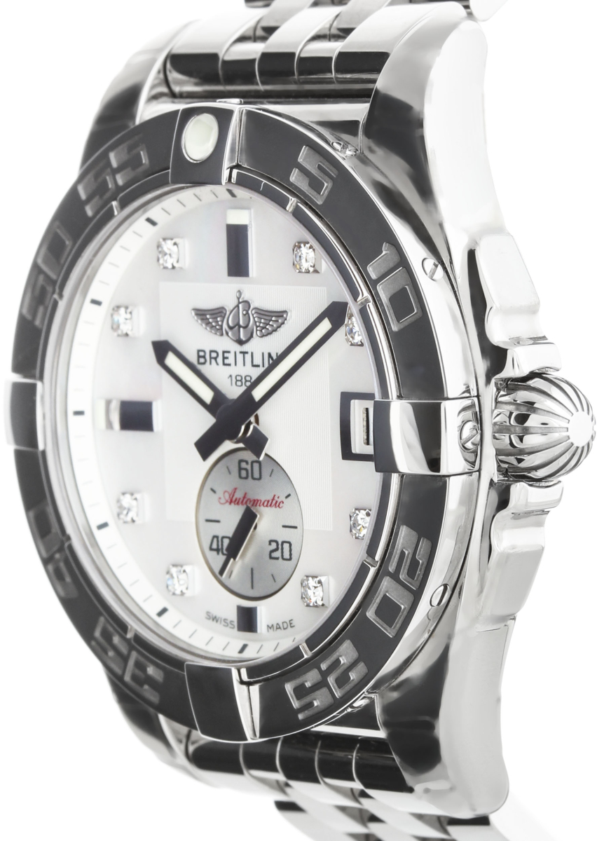Циферблат Breitling Galactic 36 Automatic выполнен из перламутра, центральная часть в виде квадрата украшена продольным гильошированием, индикатор маленькой секундной стрелки украшен гильошированием в виде концентрических кругов. Инкрустация бриллиантов в качестве часовых индексов. Аппликация эмблемы швейцарской марки и часовых индексов, а также стрелки имеют покрытие родием. Фотолюминесцентный состав на стрелках, разметке циферблата и на безеле.