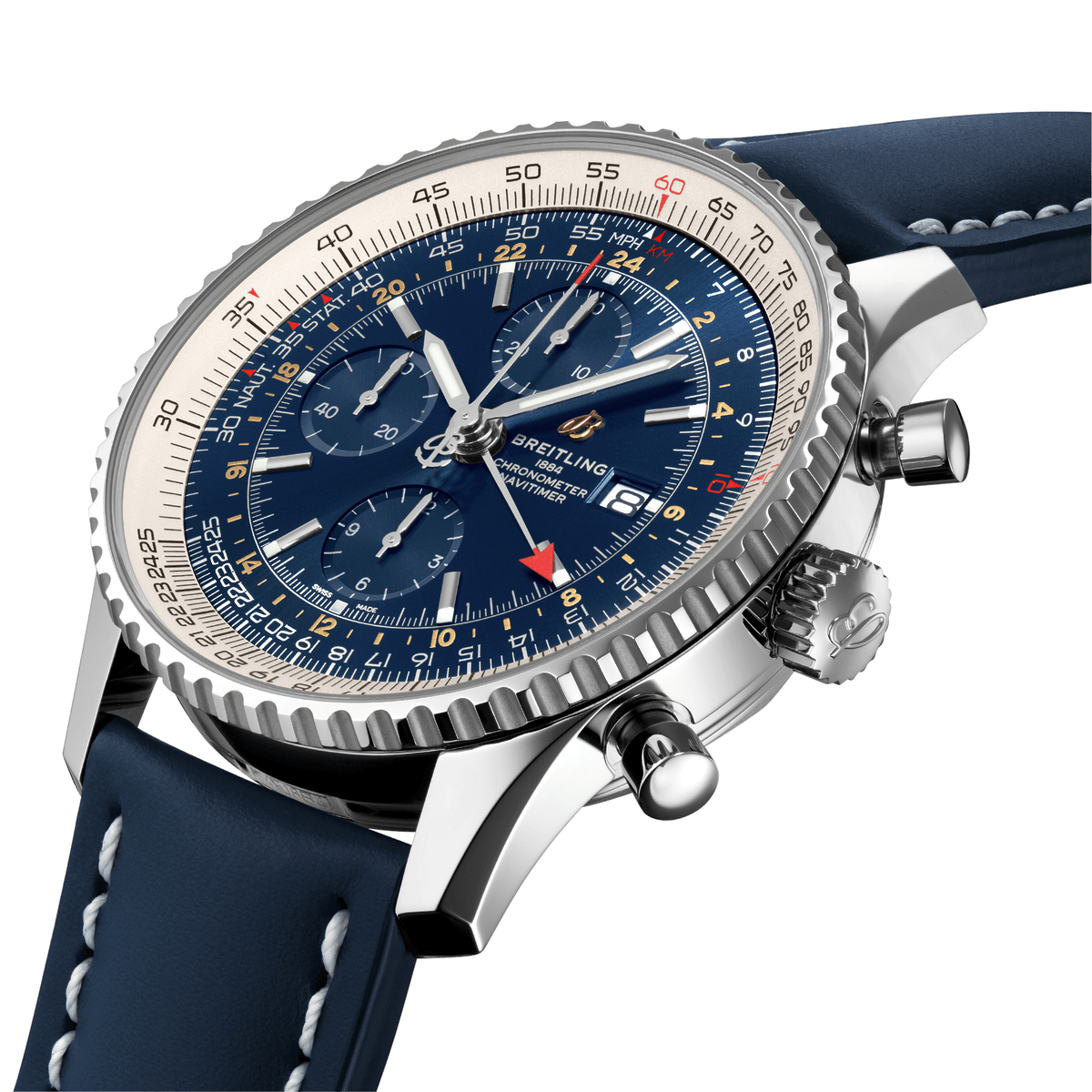 В часах Breitling Navitimer Chronograph GMT 46 A24322121C2X2 использован ремешок синего цвета из высококачественной кожи с контрастной прошивкой, ширина 24/20 мм. Браслетная застежка из нержавеющей стали, раскладывающаяся при нажатии на кнопки двойной блокировки, украшена эмблемой часовой марки.
