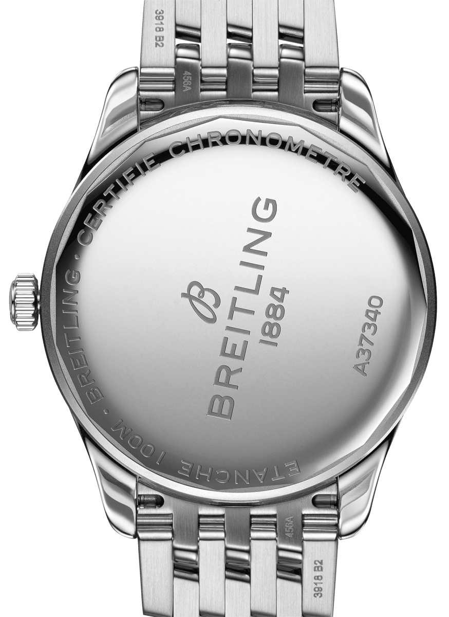 Швейцарский механизм с автоматическим заводом Breitling 37 доработан и декорирован на мануфактуре Breitling. Запас хода составляет 38 часов, частота колебаний баланса - 28 800 v.p.h, 31 рубин в качестве камневых опор и палет анкерного спуска. Точность хода каждого индивидуально пронумерованного механизма заверена сертификатом хронометра, выдаваемого Swiss Official Chronometer Testing Institute. Погрешность точности хода механизма C.O.S.C. не должна превышать -4/+6 секунд в сутки и проверяется на протяжении 15 суток, последовательно в 5 положениях при температуре 8, 23 и 38°C. Центральные часовая и минутная стрелки, маленький секундный индикатор.