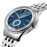 Циферблат глубокого синего цвета с шлифовкой в стиле “лучи солнца". Фотолюминесцентный состав на стрелках и на разметке циферблата. Аппликация часовых индексов и стрелки с покрытием родием и полировкой.