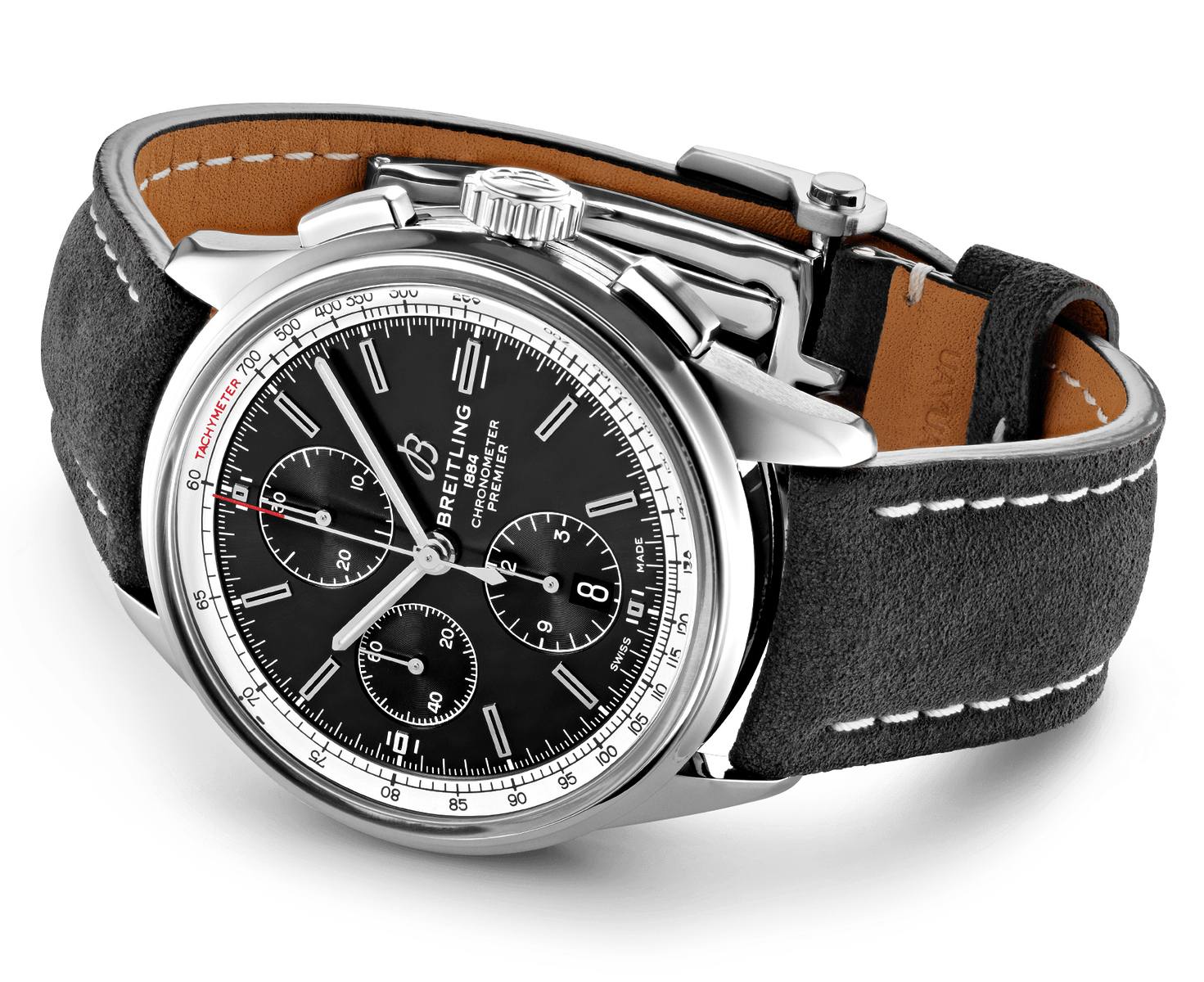 В часах Breitling Premier Chronograph 42 A13315351B1X1 использован замшевый ремешок антрацитового цвета из высококачественной кожи с контрастной прошивкой. Ширина ремешка 22/20 мм. Раскладывающаяся браслетная застежка из нержавеющей стали украшена эмблемой часовой марки.