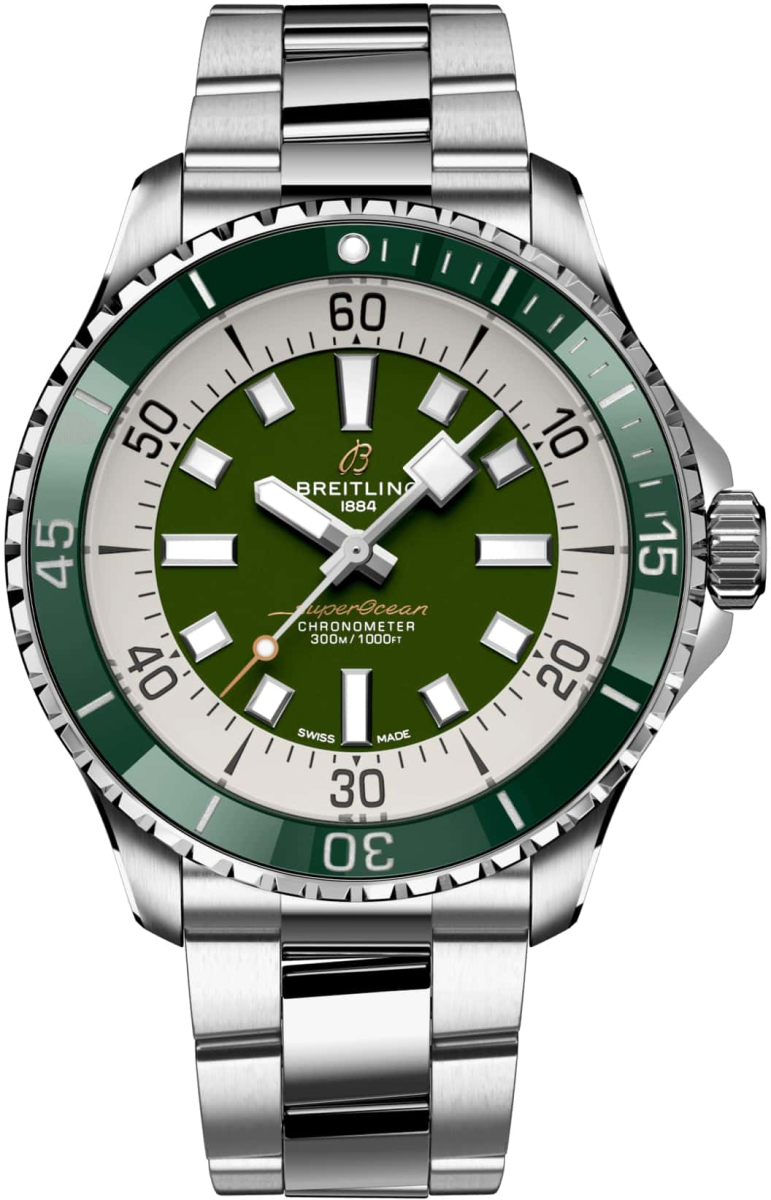 Корпус универсального размера модели Superocean Automatic 44 A17376A31L1A1 выполнен из высококачественной легированной стали с повышенной стойкостью к появлению коррозии, поверхности с матовой шлифовкой - сатинированием и полировкой до алмазного блеска. Диаметр корпуса составляет 44.00 мм, толщина - 12,6 мм. Вес - 142.00 грамм. Однонаправленный безель с накладкой из темно-зеленой керамики вращается со щелчками в только направлении против хода стрелок, боковая грань с ребристой насечкой, фронтальная поверхность с контрастной разметкой, на “12 часах” находится светящаяся в темноте капсула со фотолюминесцентным элементом. Завинчивающаяся заводная коронка с двойным уплотнителями для защиты от попадания влаги внутрь корпуса и задняя крышка с резьбовым соединением с корпусом. Водонепроницаемость 300 метров или 1000 ft.