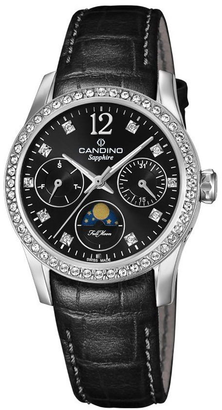 Швейцарские часы Candino Elegance C4684/3 в элегантном женственном стиле дополнены элементами роскоши. Корпус модели Candino Lady Elegance Full Moon выполнен из нержавеющей стали, украшен инкрустацией искусственных кристаллов и дополнен кожаным ремешком. Сапфировое стекло. Точный кварцевый механизм с индикацией фаз Луны.