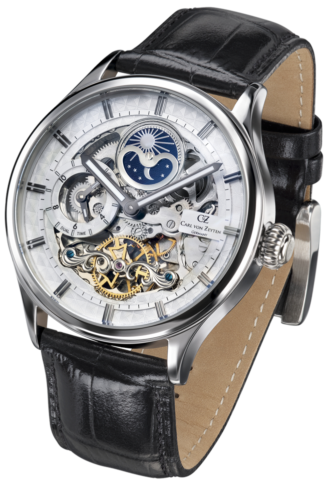Склетонизированный циферблат Carl von Zeyten Neustadt CVZ0008WH белого цвета с гильошированием. Аппликация часовых меток и стрелки с покрытием цвета родия.