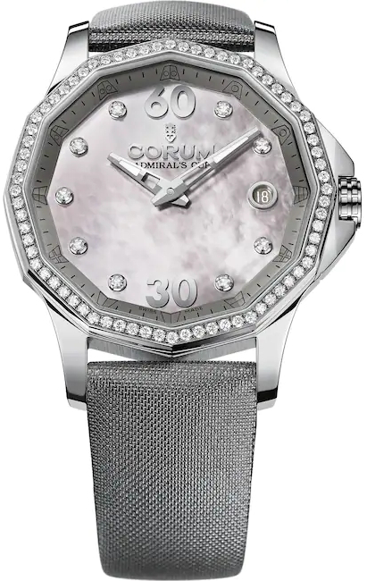 Перламутровый циферблат серого цвета. Аппликация эмблемы Corum и цифр, инкрустация 9 бриллиантов 0,1 карата в качестве часовых меток, а также фигурные стрелки с покрытием родием и финишной шлифовкой. Светящееся в темноте покрытие люминофором Superluminova стрелок.