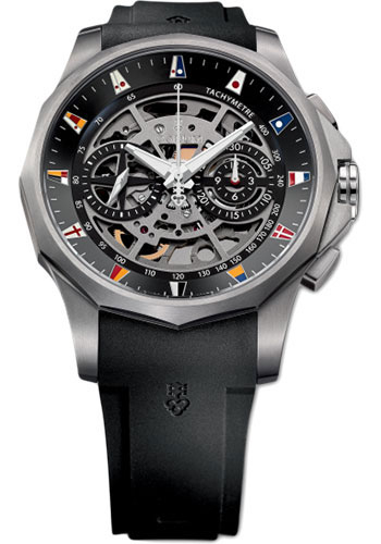 Автоматический механизм калибра CO 404. Запас хода 60 часов. 28800 полуколебаний/час, 35 камней. Двенадцатигранный титановый корпус диаметром 47 мм и толщиной 15,65 мм. Сапфировое стекло с двойным антибликовым покрытием, прозрачная задняя крышка из сапфирового стекла. Водозащита до 100 м. Черный скелетированный циферблат, украшенный морскими сигнальными флажками. Черный ремешок из вулканизированного каучука, тройная застежка.