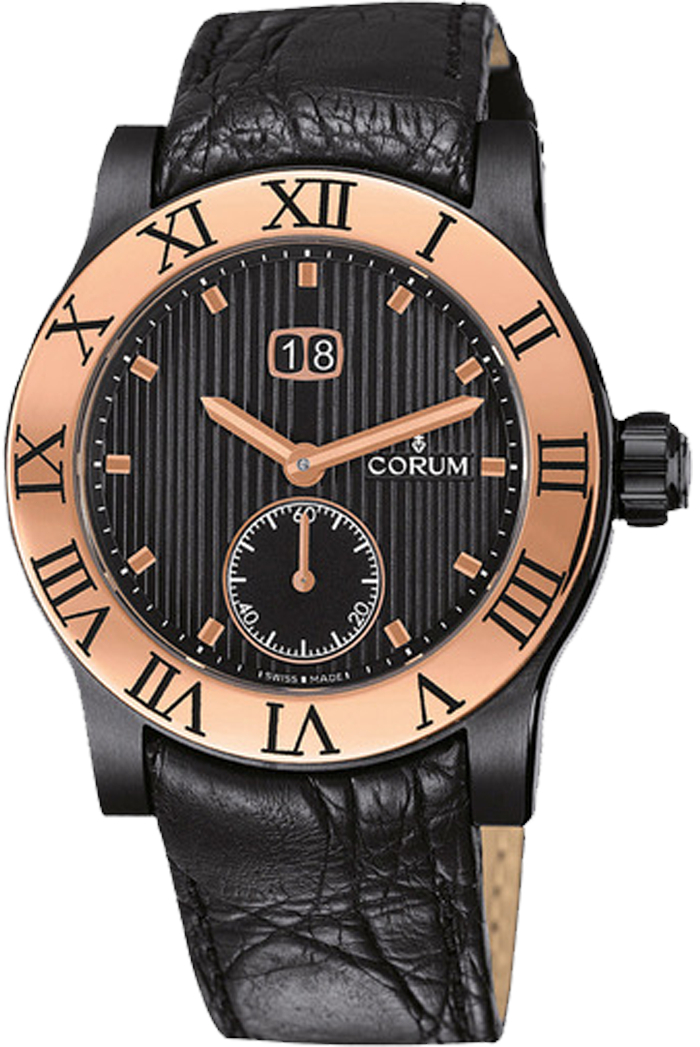 Швейцарские часы Corum Romulus 812.515.93 имеют черный ремешок из кожи аллигатора, застежка.