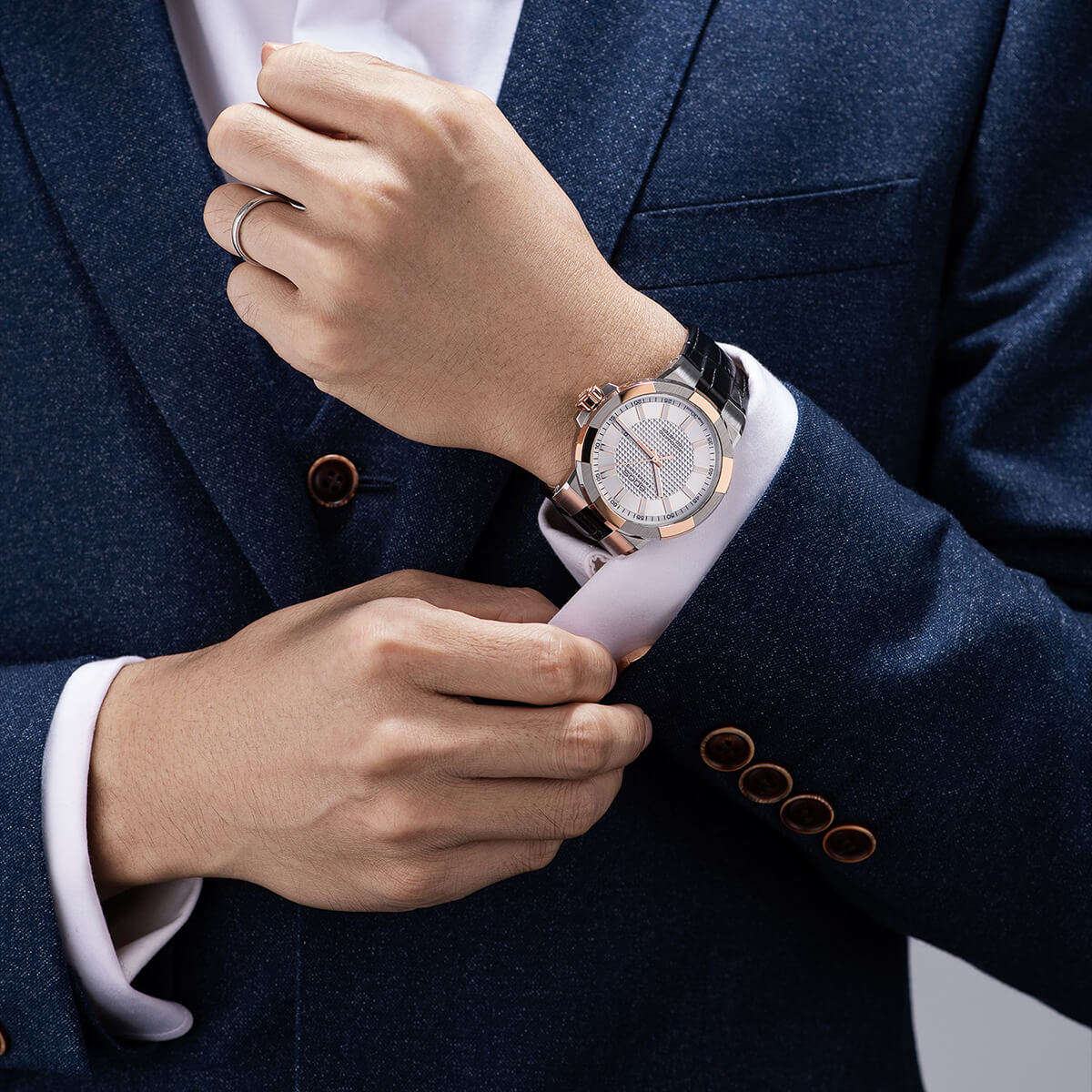 Швейцарский механизм с автоподзаводом, базовый калибр ETA 2824. Запас хода 38 часа, частота 28 800 пк/час, 25 камней. Центральные часовая, минутная и секундная стрелки. Индикация даты в апертуре находящейся на отметке “3 часа”.