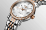 Модель Longines Elegant L4.309.5.88.7 поставляется с браслетом из нержавеющей стали с литыми звеньями разного размера в 7 рядов, 2 центральных ряда с покрытием “cap 200” розовым золотом 18К, ширина 13 мм, браслетная застежка тройного сложения “бабочка” раскладывается при нажатии кнопок двойной фиксации.