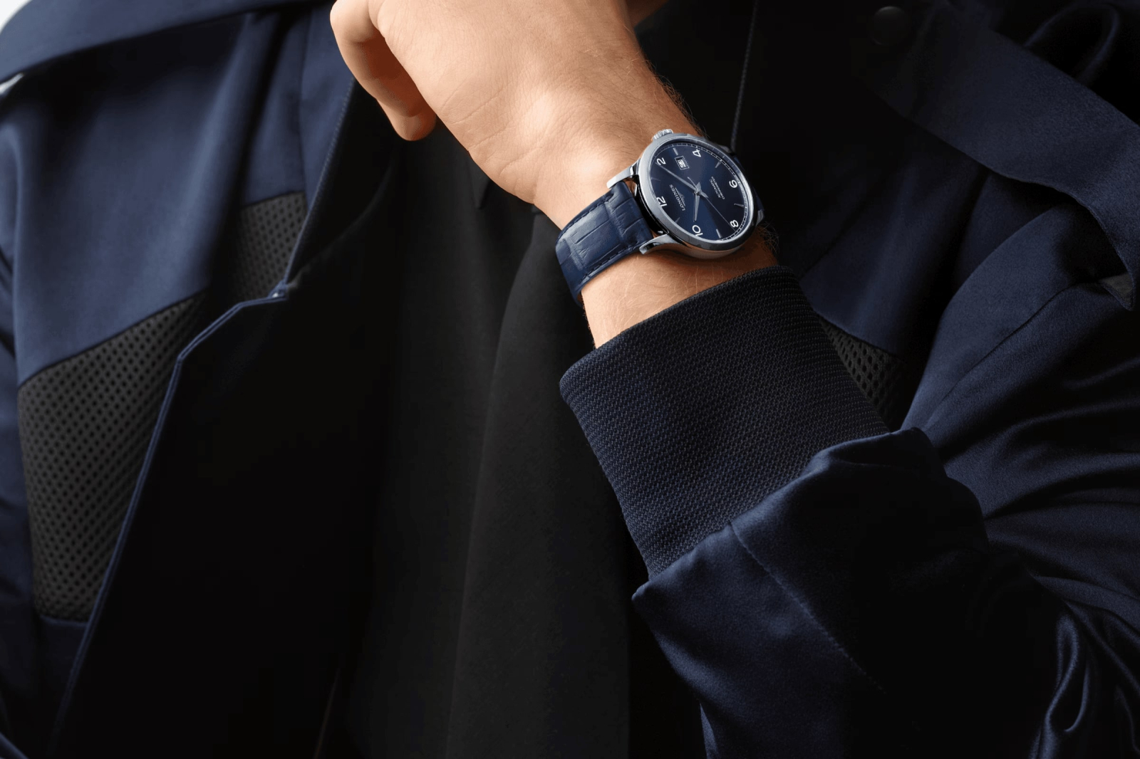Модель Longines Record L2.821.4.96.4 поставляется с темно-синим ремешком из кожи аллигатора, ширина 20 мм, браслетная застежка тройного сложения “бабочка” из нержавеющей стали раскладывается при нажатии кнопок двойной фиксации.