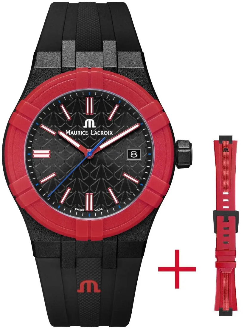 Круглый корпус Maurice Lacroix #tide Mahindra AI2008-04000-400-J черного и красного цветов выполнен из переработанного пластика, ранее загрязнявшего Мировой океан. Диаметр корпуса составляет 40 мм. Водостойкость 10 ATM.