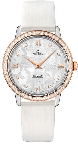 Швейцарские часы Omega De Ville Prestige «Butterfly» 424.27.33.60.52.001 созданы для успешных женщин, предпочитающих классический элегантный дизайн. Модели Omega De Ville Prestige отличаются чистотой линий, роскошной отделкой и всегда актуальным дизайном. Серебристый циферблат с уникальным полированным узором «Butterfly» в виде бабочек, которых нанесены переводным способом. Внутри корпуса универсального размера из стали и розового золота, украшенного бриллиантами, работает высокоточный кварцевый механизм Omega.