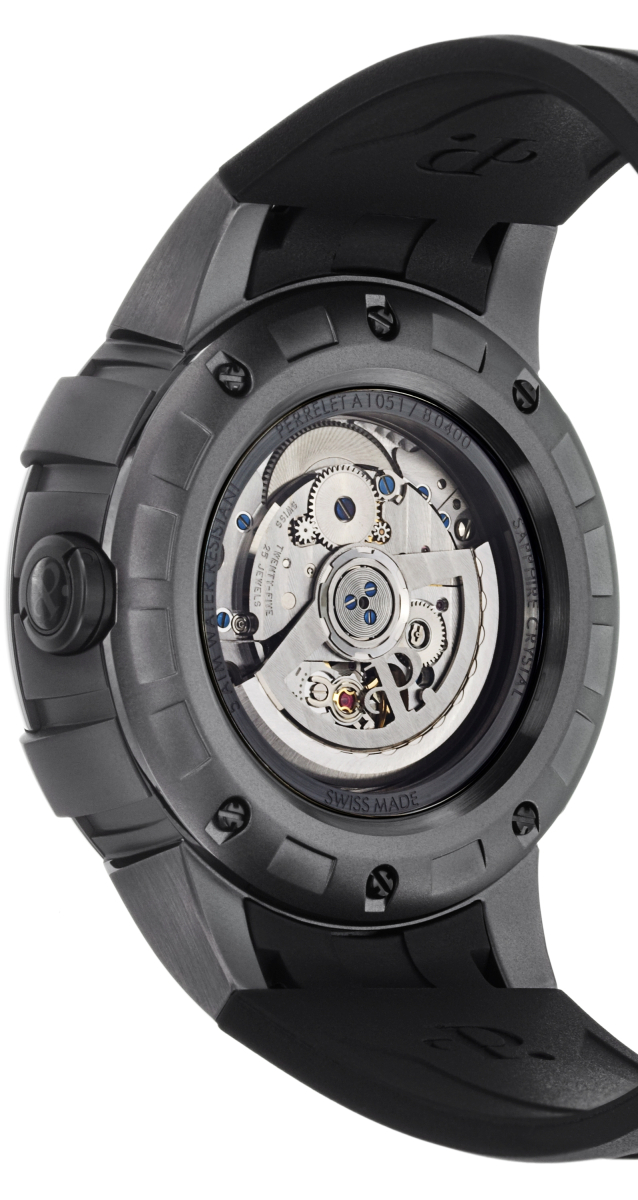 Круглый корпус Perrelet A1051/4 выполнен из высокосортной нерж. стали с зеркальной полировкой и матовой шлифовкой поверхностей со стойким к царапинам PVD покрытием черного цвета. Диаметр корпуса составляет 48 мм, толщина - 14,3 мм. Заводная коронка, украшенная лаковой миниатюрой с эмблемой марки, интегрирована в корпус. Задняя крышка с прозрачным окном соединяется с корпусом 6 винтами. Водостойкость 5 АТМ.
