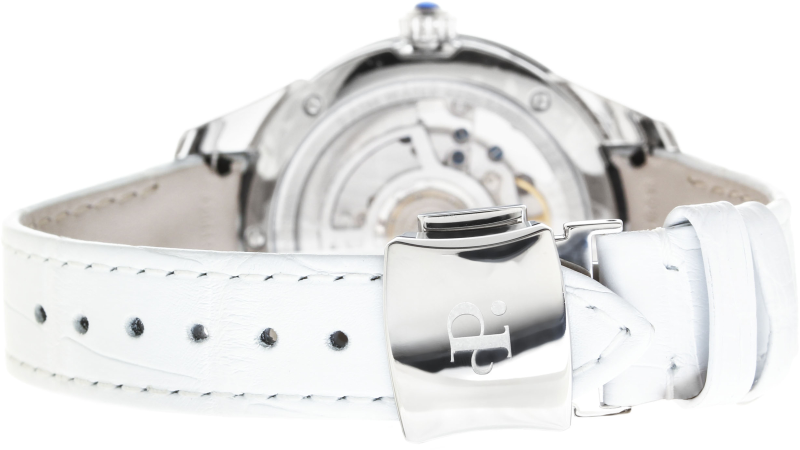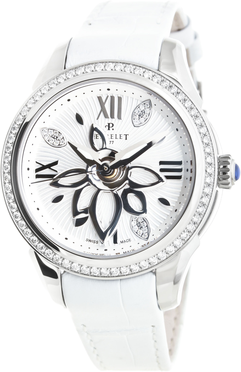 Циферблат белого цвета с гильошированием и видимым ротором автоподзавода Double Rotor, стилизованным под лепестки цветка, инкрустациея 24 бриллиантов Top Wesselton VSI весом 0.06 карат. Фигурные стрелки "листок" с финишной обработкой родием.