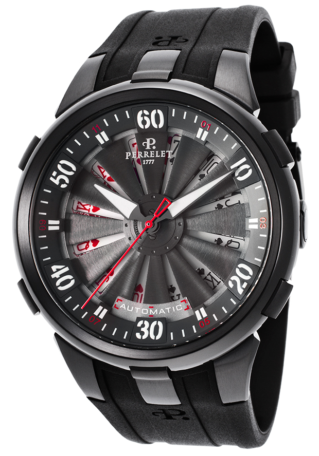 Швейцарские часы Perrelet Turbine XL Vegas A4052/1 созданы для современных мужчин, обладающих отличным вкусом и ценящих индивидуальный стиль. Модель Turbine XL Vegas входит в серию посвященную миру азарта и игорным заведениям, данная модель создана в честь Лас-Вегаса. Круглый корпус выполнен из высококачественной нержавеющей стали с черным покрытием. Мануфактурный механизма с двойным ротором автоматического подзавода.