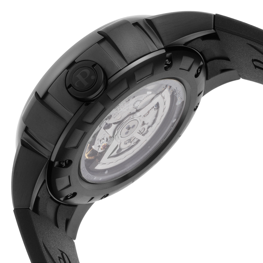 Круглый корпус Perrelet A4052/1 выполнен из высокосортной нерж. стали с зеркальной полировкой и матовой шлифовкой поверхностей со стойким к царапинам PVD покрытием черного цвета. Диаметр корпуса составляет 48 мм, толщина - 14,3 мм. Заводная коронка, украшенная лаковой миниатюрой с эмблемой марки, интегрирована в корпус. Задняя крышка с прозрачным окном соединяется с корпусом 6 винтами. Водостойкость 5 АТМ.