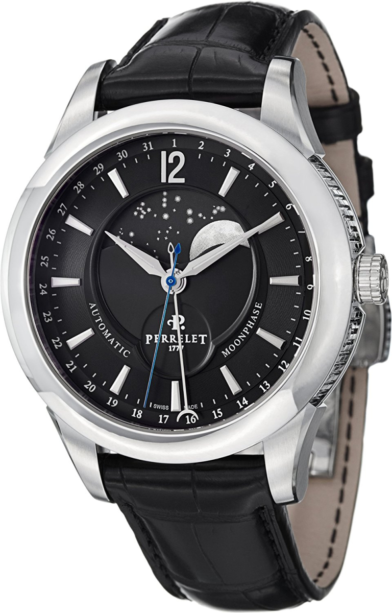 Это модные мужские часы. Материал корпуса часов — сталь. Циферблат часов защищает сапфировое стекло. Основной цвет циферблата черный. В этих часах используются такие усложнения как фаза луны, .