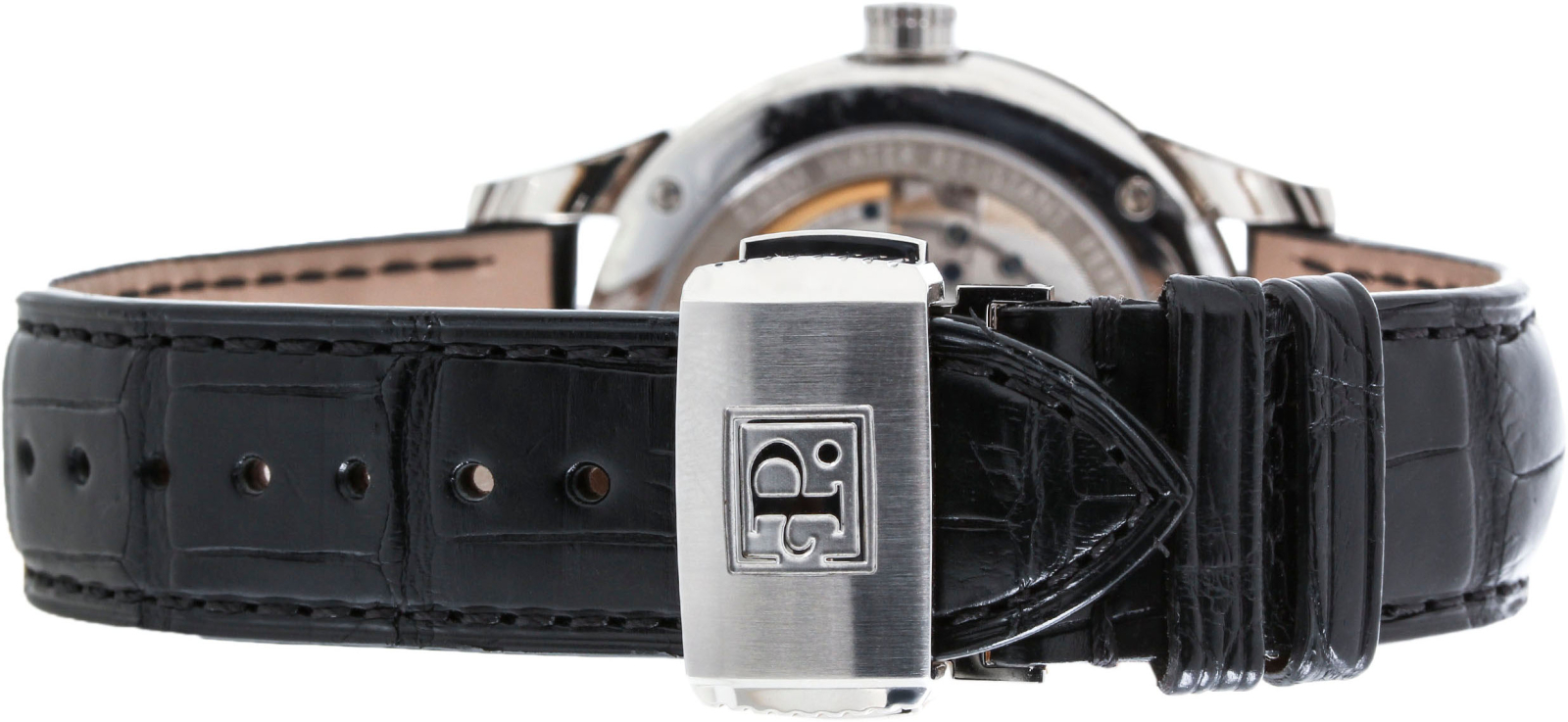 Ремешок Jumping Hour A1037/7 черного цвета выполнен из кожи аллигатора, браслетная застежка тройного сложения “бабочка” раскладывается при нажатии на кнопки двойной фиксации.