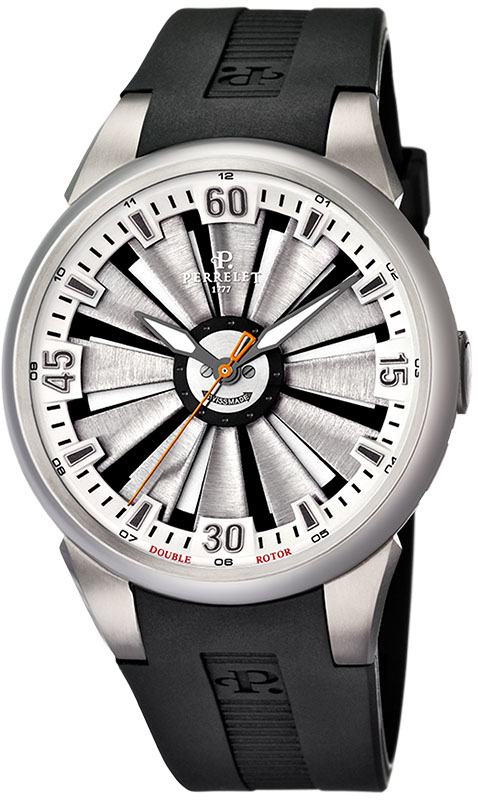 Циферблат с видимым ротором автоподзавода Double Rotor, стилизованным под лопатки турбины реактивного самолета. Поверхность циферблата под вращающимся в двух направлениях ротором серебристого цвета, аппликация часовых индексов и стрелок с люминесцентным покрытием.