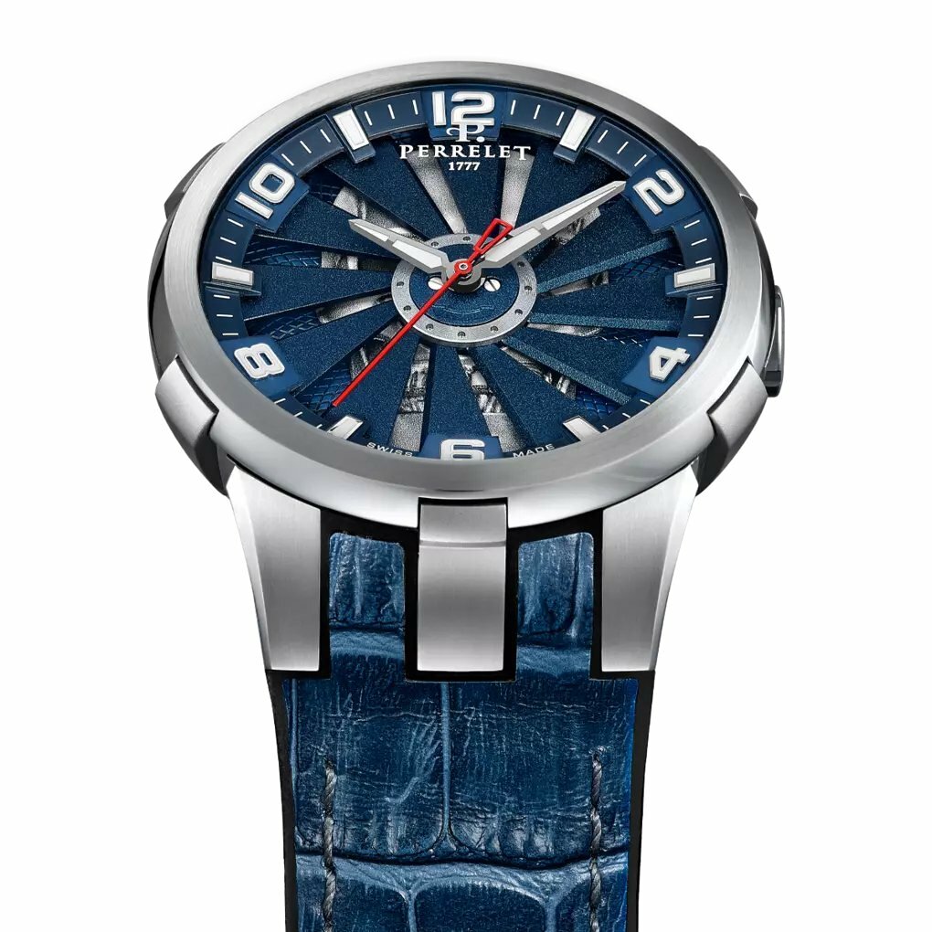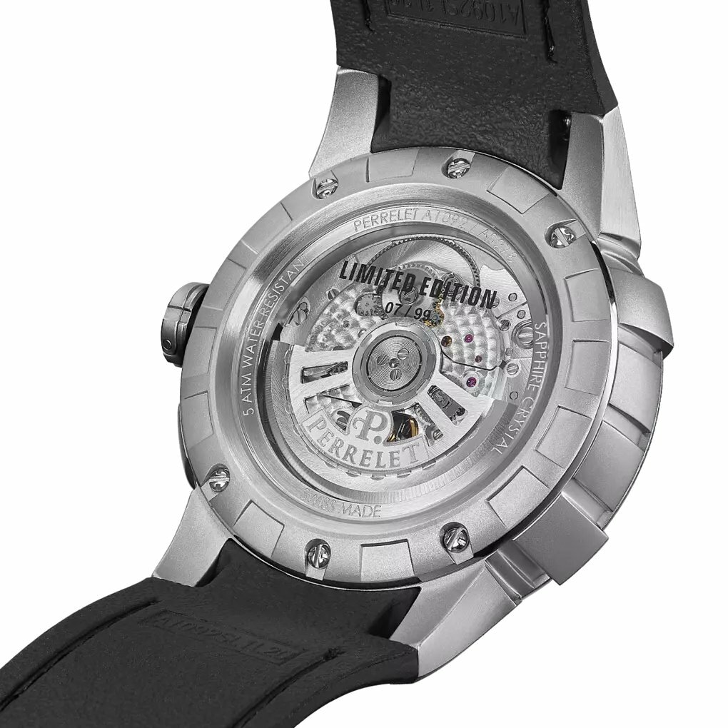Швейцарский механизм с автоматическим подзаводом In-house калибр Perrelet P-331-MH модифицированный и декорированный на мануфактуре Perrelet. Фирменная технология Double Rotor предполагает установку двух независимых роторов автородзавода, один из которых находится со стороны циферблата. Запас хода составляет около 42 часов, частота колебаний баланса 28.800 v.p.h или 4 Гц, 92 компонента и 25 рубинов в качестве камневых опор и палет анкерной вилки. Мосты и платина имеют покрытие родием и украшены финишной шлифовкой Circular grained и Cotes de Geneve, полый ротор автоподзавода декорирован в стиле “Perrelet”, шляпки винтов отполированы и декорированы синением. Точность хода механизма часов из этой юбилейной серии отрегулирована в соответствии с сертификатом C.O.S.C. Функции: часовая, минутная и секундная стрелки.