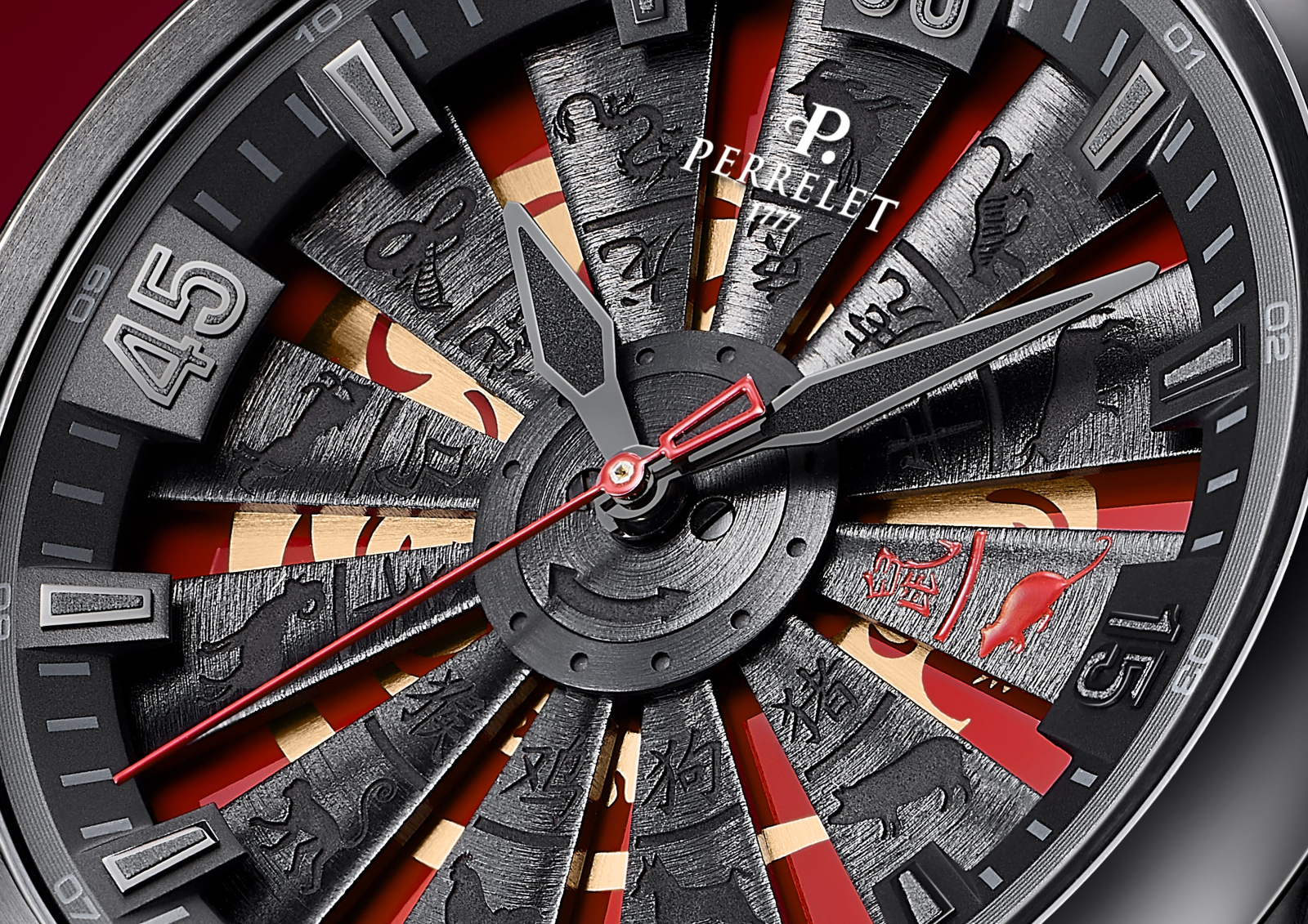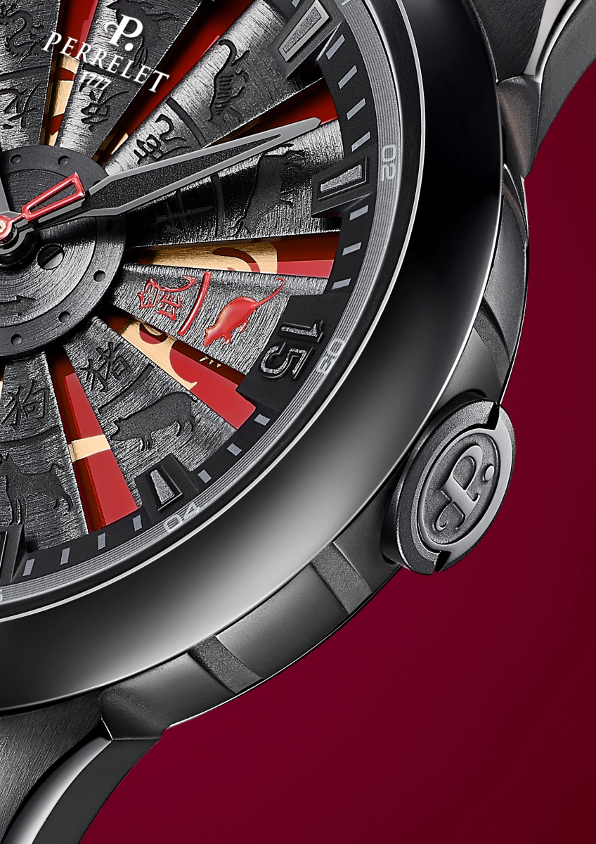 Циферблат с видимым ротором автоподзавода Double Rotor, стилизованным под лопатки турбины реактивного самолета, которые украшены гравировкой с китайскими знаками зодиака. Поверхность циферблата под вращающимся в двух направлениях ротором темно-красного цвета украшена иероглифом, аппликация часовых индексов, цифр и стрелок с люминесцентным покрытием.