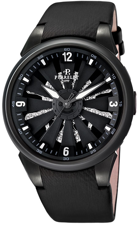 Швейцарские часы Perrelet Turbine A4022/1 созданы для современных представительниц прекрасной половины человечества, обладающих отличным вкусом, ценящих роскошный индивидуальный стиль и не чуждых провокации. Модель Turbine Toxic Special Editions с необычным запоминающимся дизайном. Циферблат, скрытый 12 лопастями турбины, украшен инкрустацией бриллиантов в виде “Веселого Роджера” - черепа с костями. Круглый корпус имеет форму tambour (барабан) и выполнен из высококачественной стали с черным PVD покрытием. Мануфактурный механизма с двойным ротором автоматического подзавода.