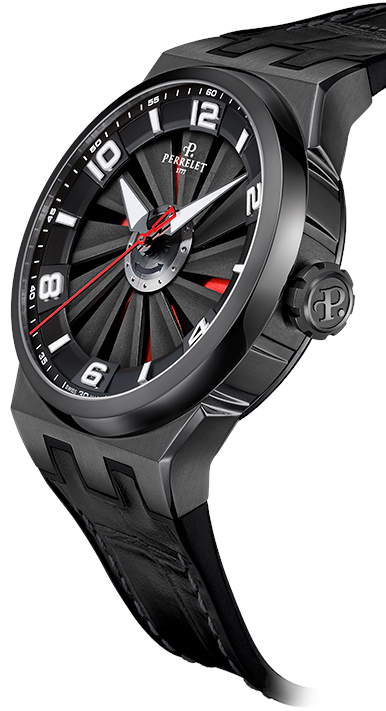 Круглый корпус Perrelet Turbine EVO A4063/A выполнен из высокосортной нерж. стали с полировкой и матовой шлифовкой (сатинированием) поверхностей. Стойкое к царапинам PVD покрытие черного цвета. Диаметр корпуса составляет 44 мм, толщина - 13 мм. Заводная коронка имеет форму бриллиант и украшена миниатюрой с эмблемой марки. Задняя крышка с прозрачным окном соединяется с корпусом 6 винтами. Водостойкость 5 АТМ.
