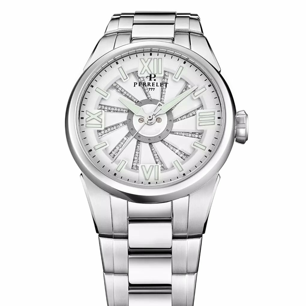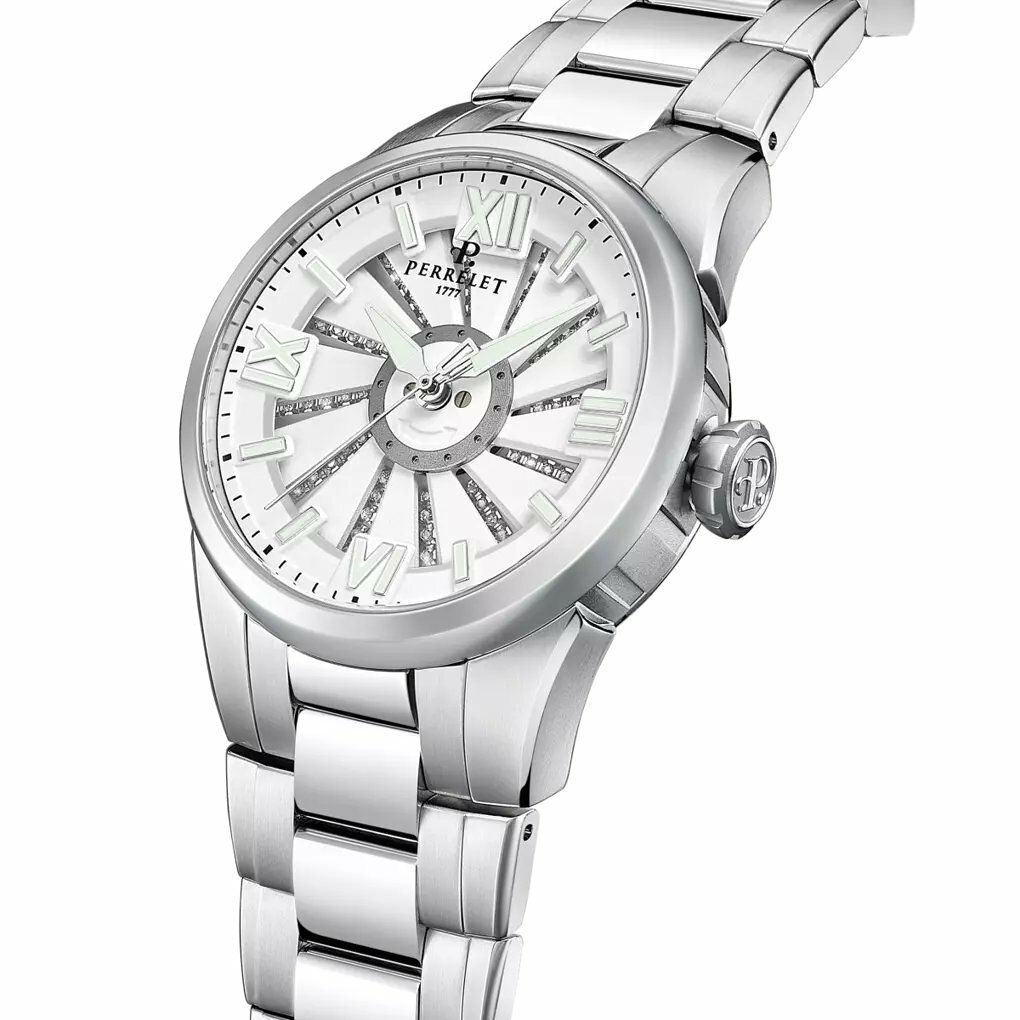 Швейцарские часы Perrelet Turbine Lady Frost A4069/1 созданы для современных представительниц прекрасной половины человечества, обладающих отличным вкусом, ценящих роскошный индивидуальный стиль и не чуждых провокации. Модель Turbine с поскошным запоминающимся дизайном. Циферблат украшен инкрустацией бриллиантов. Круглый корпус имеет форму tambour (барабан) и выполнен из высококачественной стали. Мануфактурный механизма с двойным ротором автоматического подзавода.