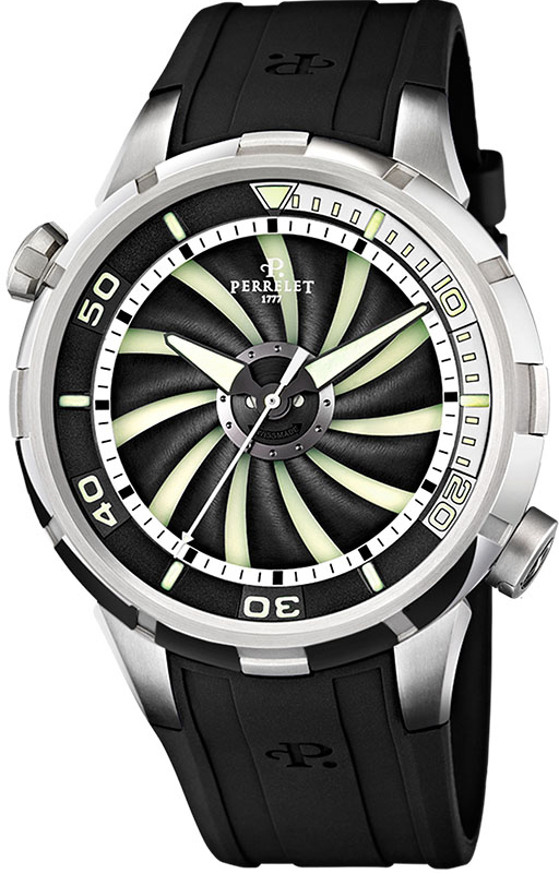 ОписаниеШвейцарские часы Perrelet Turbine Diver A1066/1Данная модель входит в коллекцию Turbine. Это стильные мужские часы. Материал корпуса часов — сталь. Циферблат часов защищает сапфировое стекло. Цвет циферблата - черный.57024