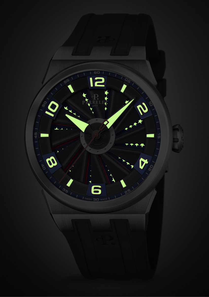 Швейцарские часы Perrelet Turbine United A4062/S1 созданы для современных мужчин и посвящены государственному флагу США. Модели Turbine United в спортивном стиле имеют обновленный дизайн. Основная фишка Turbine United это циферблат, украшенный чередующимися красными, белыми и звездно-голубыми лучами. Благодаря вращению 12 черных лопастей из черного анодированного алюминия появляются знаменитые звезды и полосы американского флага, изображенные на циферблате под турбиной. Еще одно завораживающее зрелище происходит в темноте, когда звезды и белые полосы флага загораются люминесцентным светом. Механизмы Turbine United являются сертифицированными хронометрами. Модель выпущена специальной серией лимитированной 25 экземплярами.